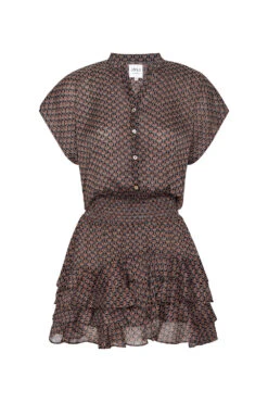 Evie is an effortless and versatile mini silhouette cut from our Brown ditsy floral printed chiffon. Featuring a double-lined self-covered summary-down bodice, smocked elastic waistband and layers of asymmetric tiered ruffles on a slightly curved hem skirt. This best-selling style is flattering and versatile.