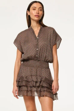 Evie is an effortless and versatile mini silhouette cut from our Brown ditsy floral printed chiffon. Featuring a double-lined self-covered summary-down bodice, smocked elastic waistband and layers of asymmetric tiered ruffles on a slightly curved hem skirt. This best-selling style is flattering and versatile.