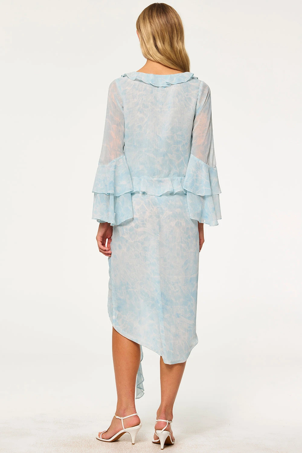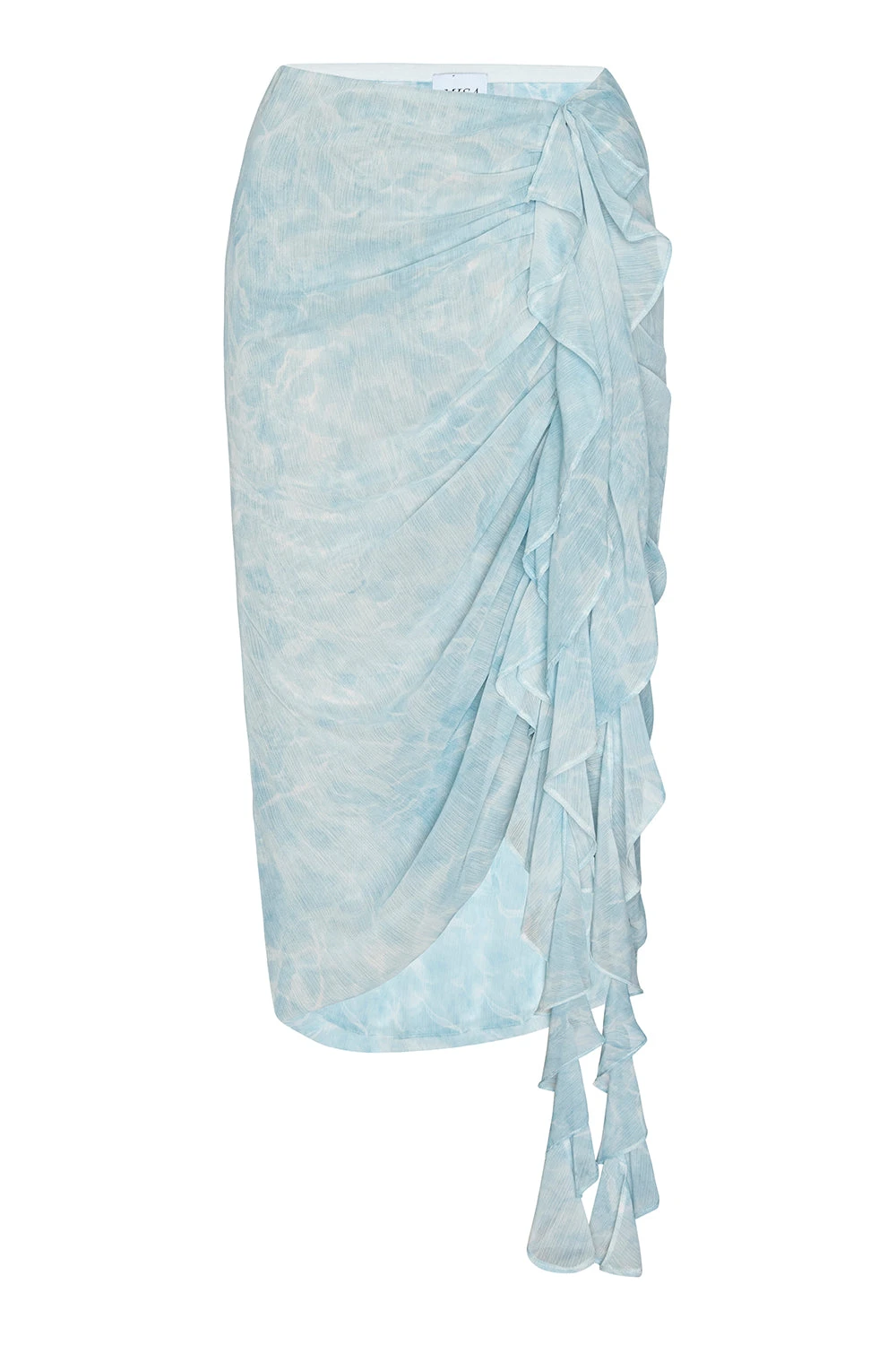 Farida is a feminine midi-length pencil skirt cut from airy Acqua Blue chiffon. Designed with gathered detailing at the waist and hem, it’s finished with flowing chiffon ribbons and an asymmetric hemline for graceful movement. A hidden side zip ensures a smooth fit. Pair with the coordinating Ceria Top for an effortlessly chic look, whether dressed up or worn casually.