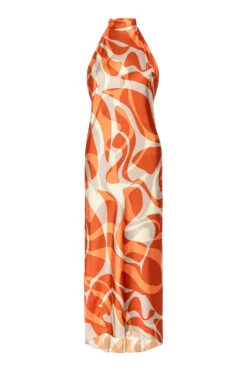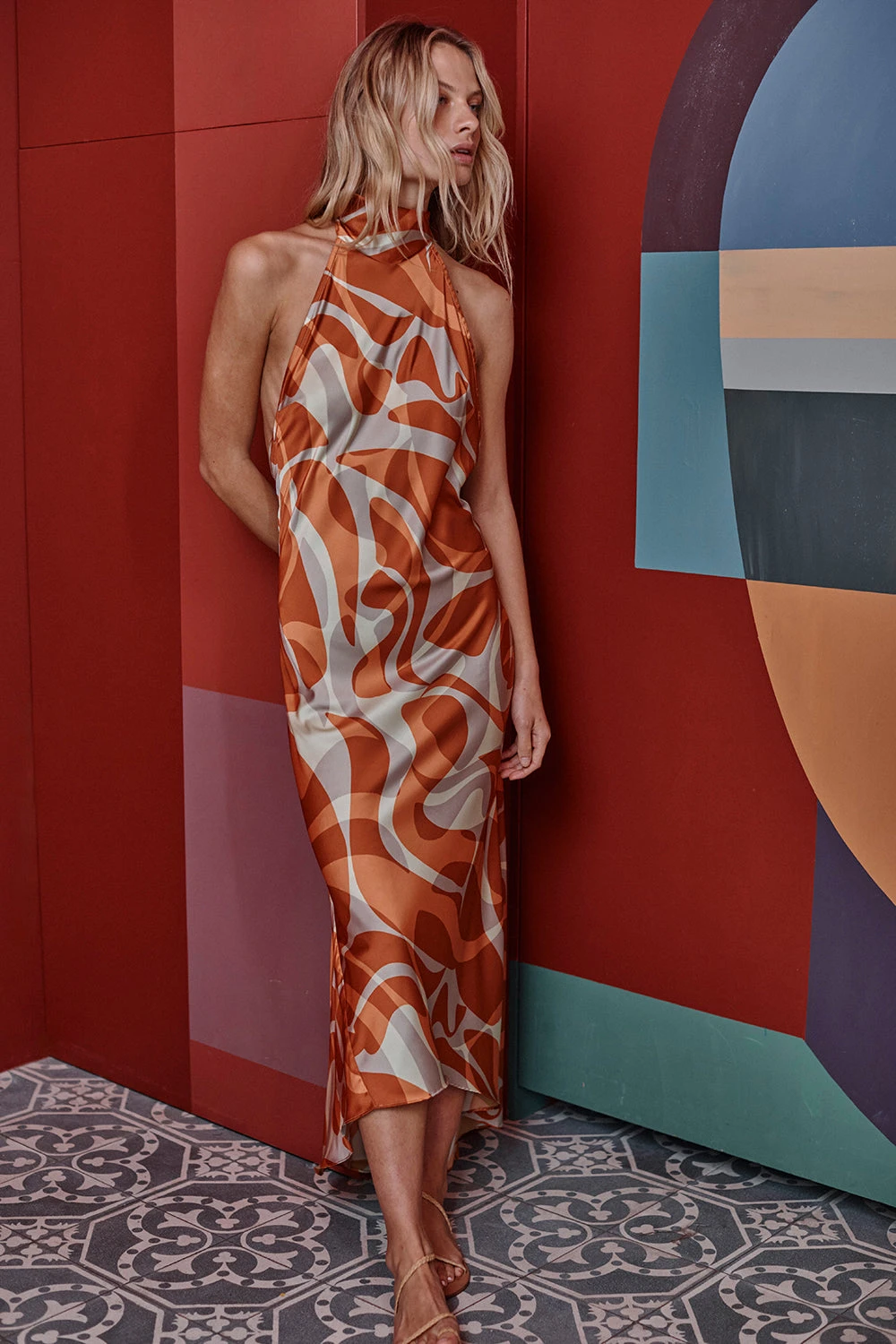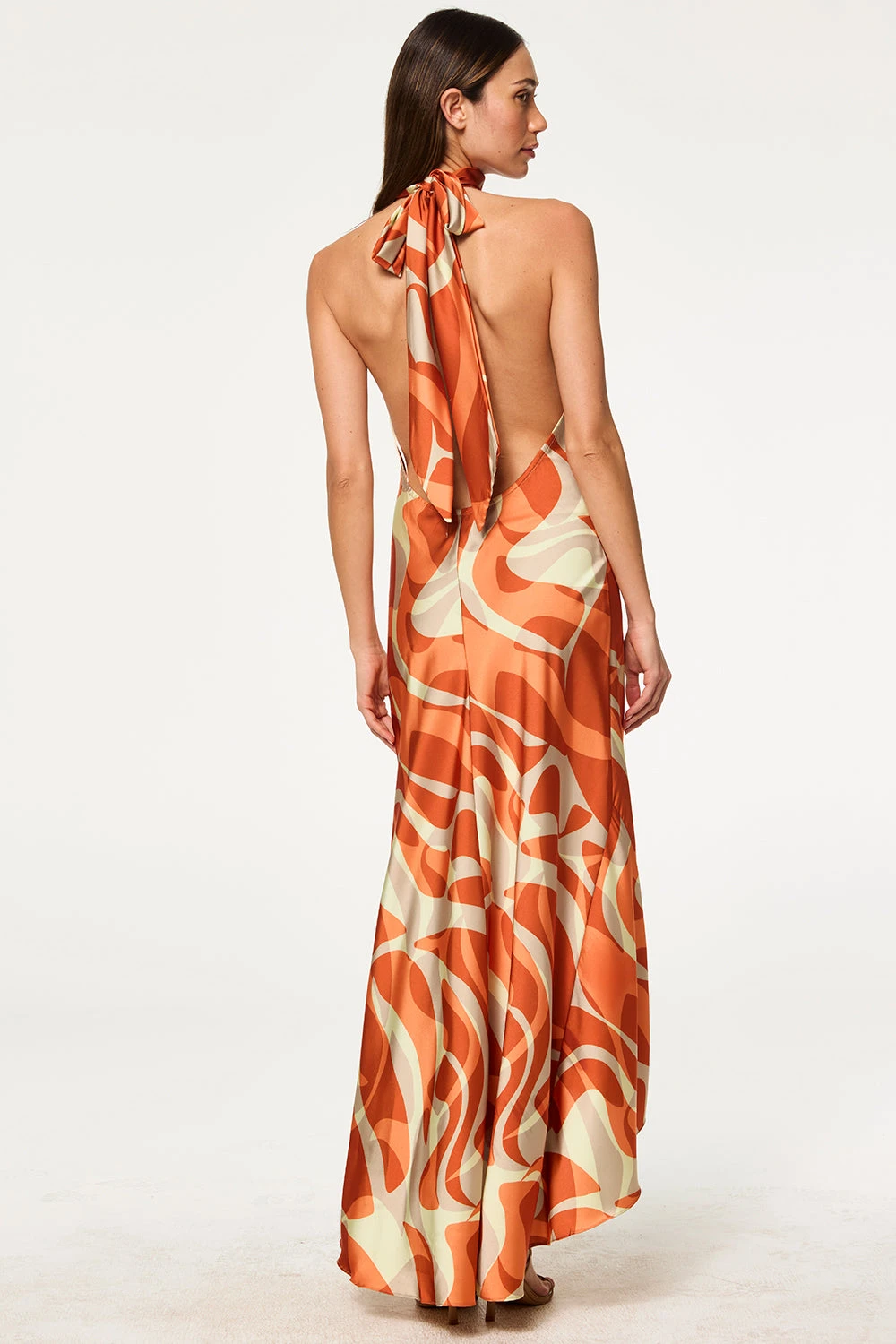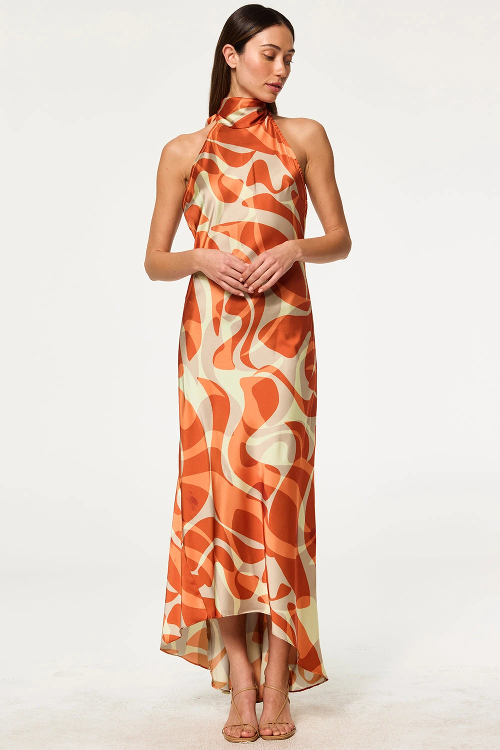 Stun in a daring silhouette that’s perfect for all your late summer and into fall events. The Fiore dress is cut from vibrant Abstract Summer Shade satin and designed with a tie halter neckline and a plunging low back. This ankle-grazing style features a curved high-low hem for graceful movement. Pair it with strappy heels for your next soirée or dress it down with flat sandals for your next getaway.