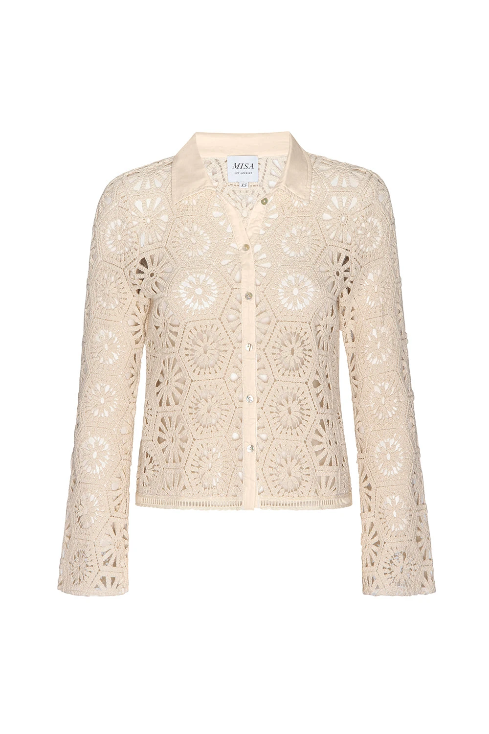 Fleur is a fitted cream crochet top with intricate lace detailing throughout. Designed with long sleeves, a summary-front closure, and a crisp contrast cotton foldover collar. Unlined for a lightweight, easy feel. Pair with the Ronin Skirt for a timeless and versatile set.