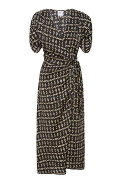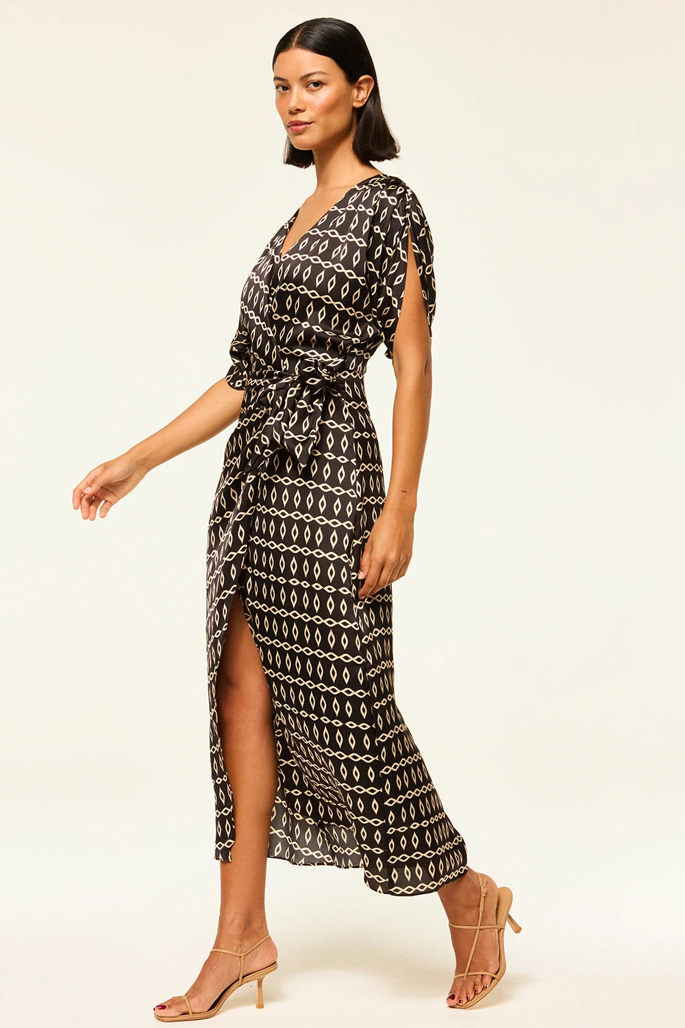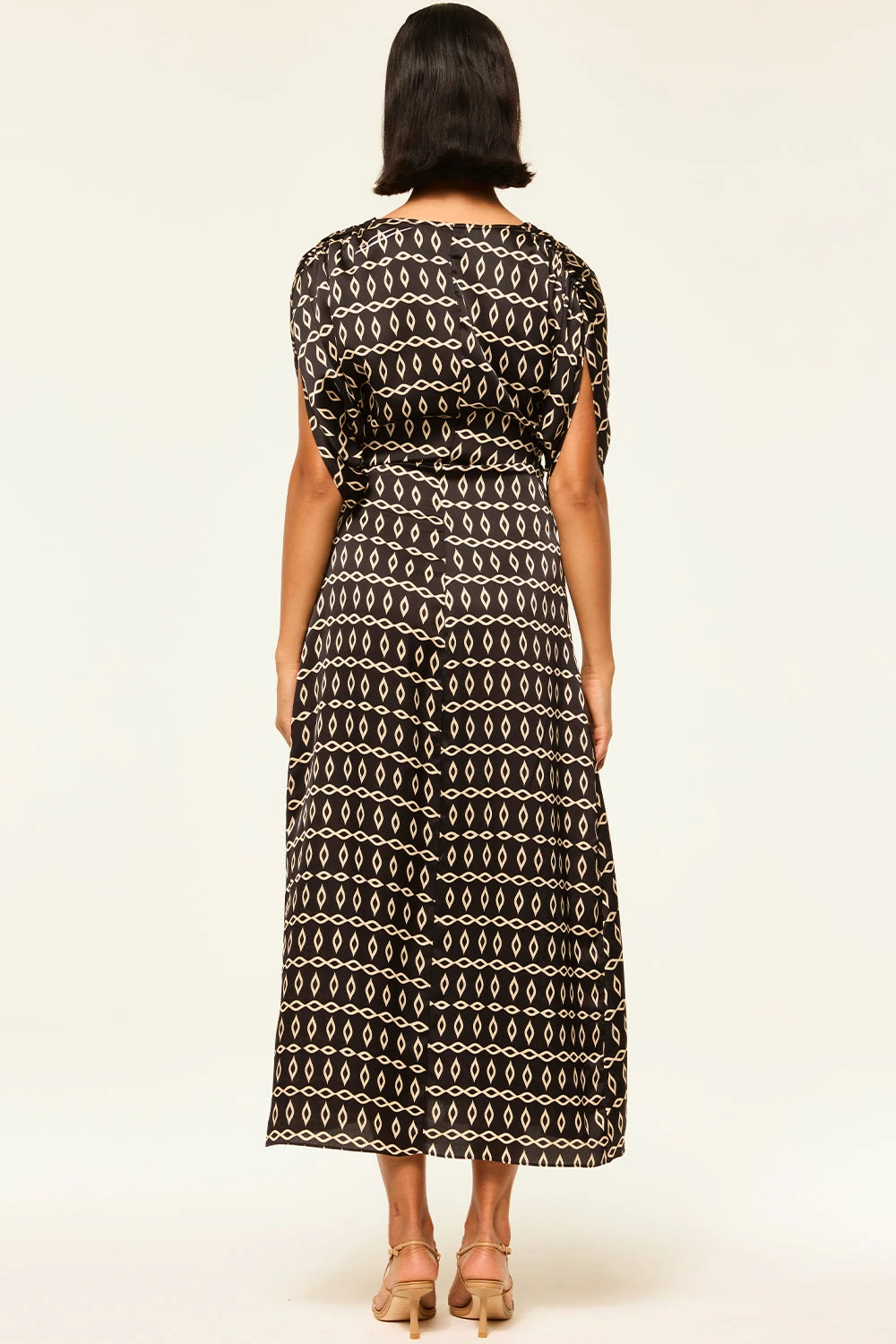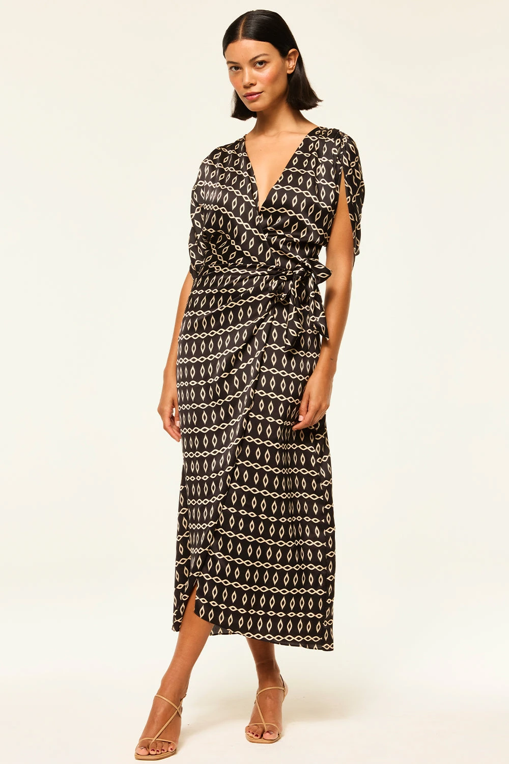 Our newest Francesca dress is an effortless midi wrap dress cut from a timeless Go West Geo printed satin on black ground. Featuring an adjustable tie waist, v-neckline, short sleeves and ruched shoulder details. Style with boots or a strappy heel depending on the occasion.