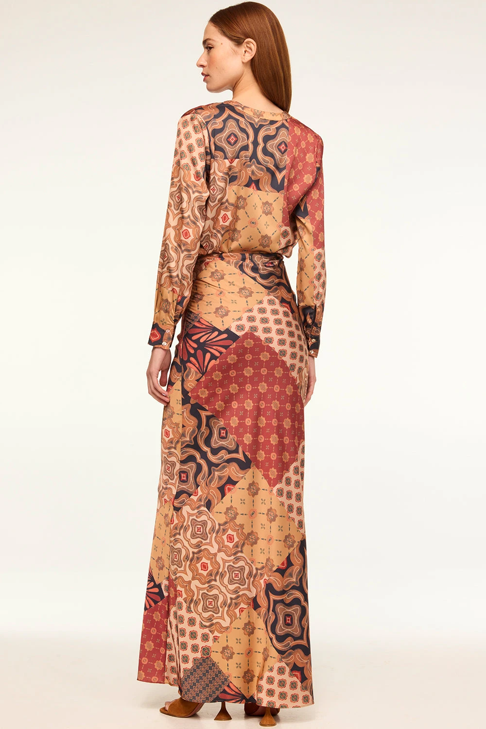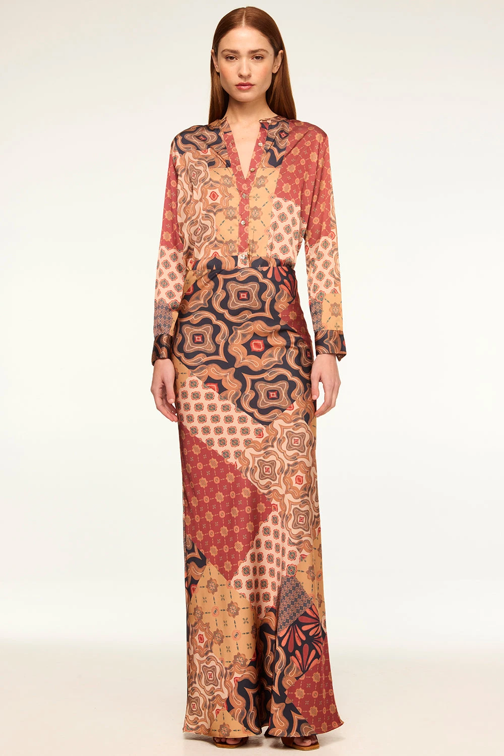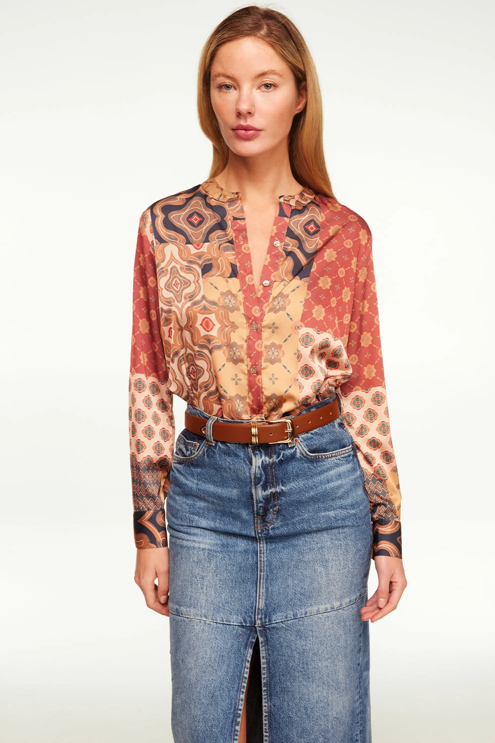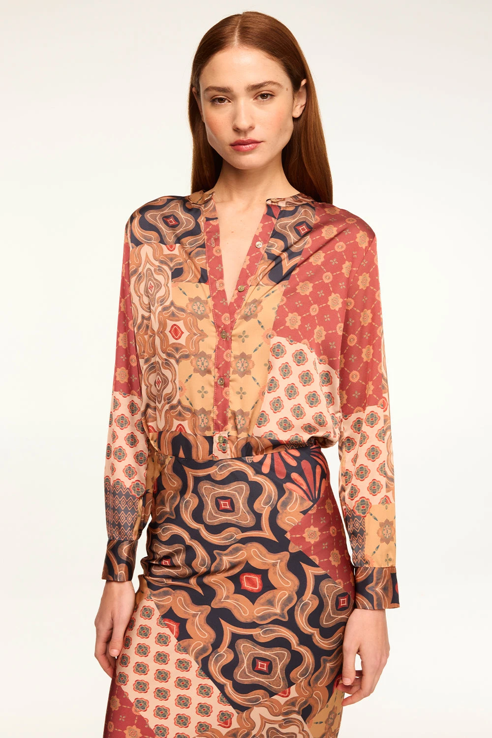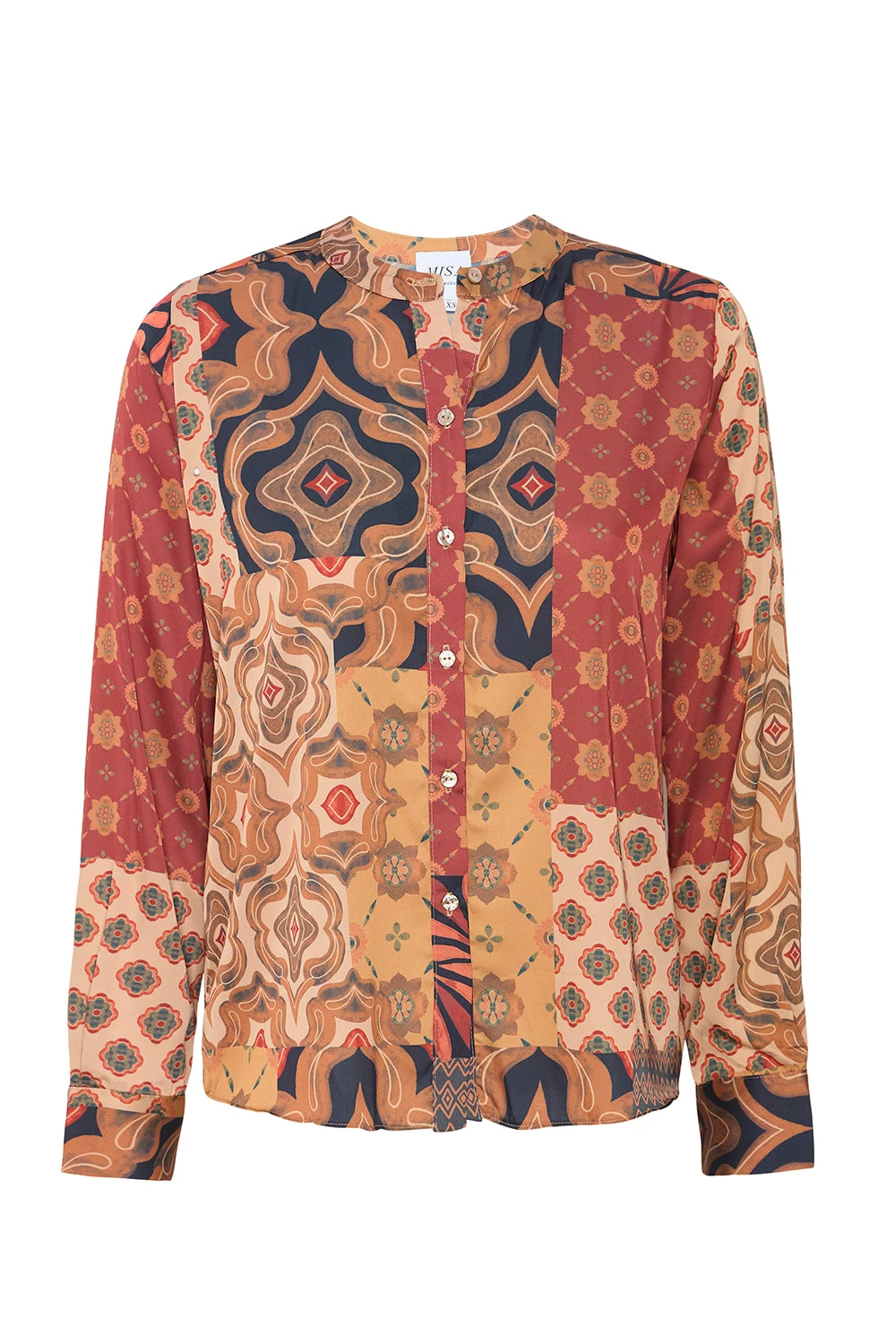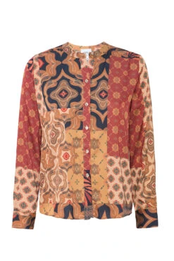 Our Frankie top is a collarless easy summary-front blouse cut from our Surreal Patchwork printed satin. Long sleeves with double-summary cuffs. Wear with the coordinating Sierra skirt or dress down with a pair of your favorite denim.
