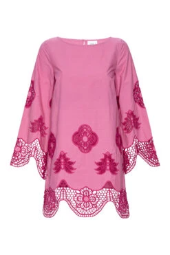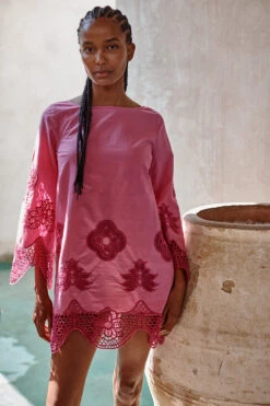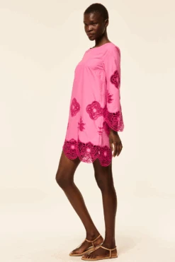 Gallica is a versatile silhouette perfect for transitioning from spring to summer. Made from vibrant fuchsia cotton, it features embroidered lace details along the body, sleeves, cuffs, and hem. The boat neckline and three-quarter length sleeves add a refined touch, while the dress is fully lined for comfort. Hits at the mid thigh. Pair it with sandals for an effortless daytime look.