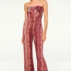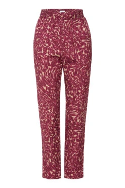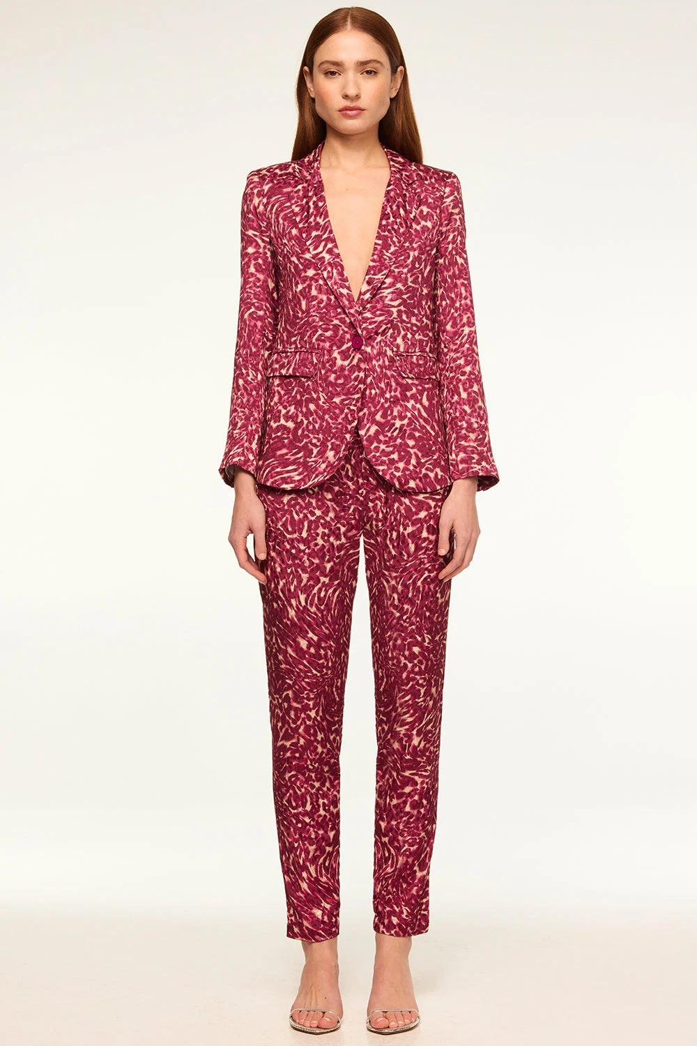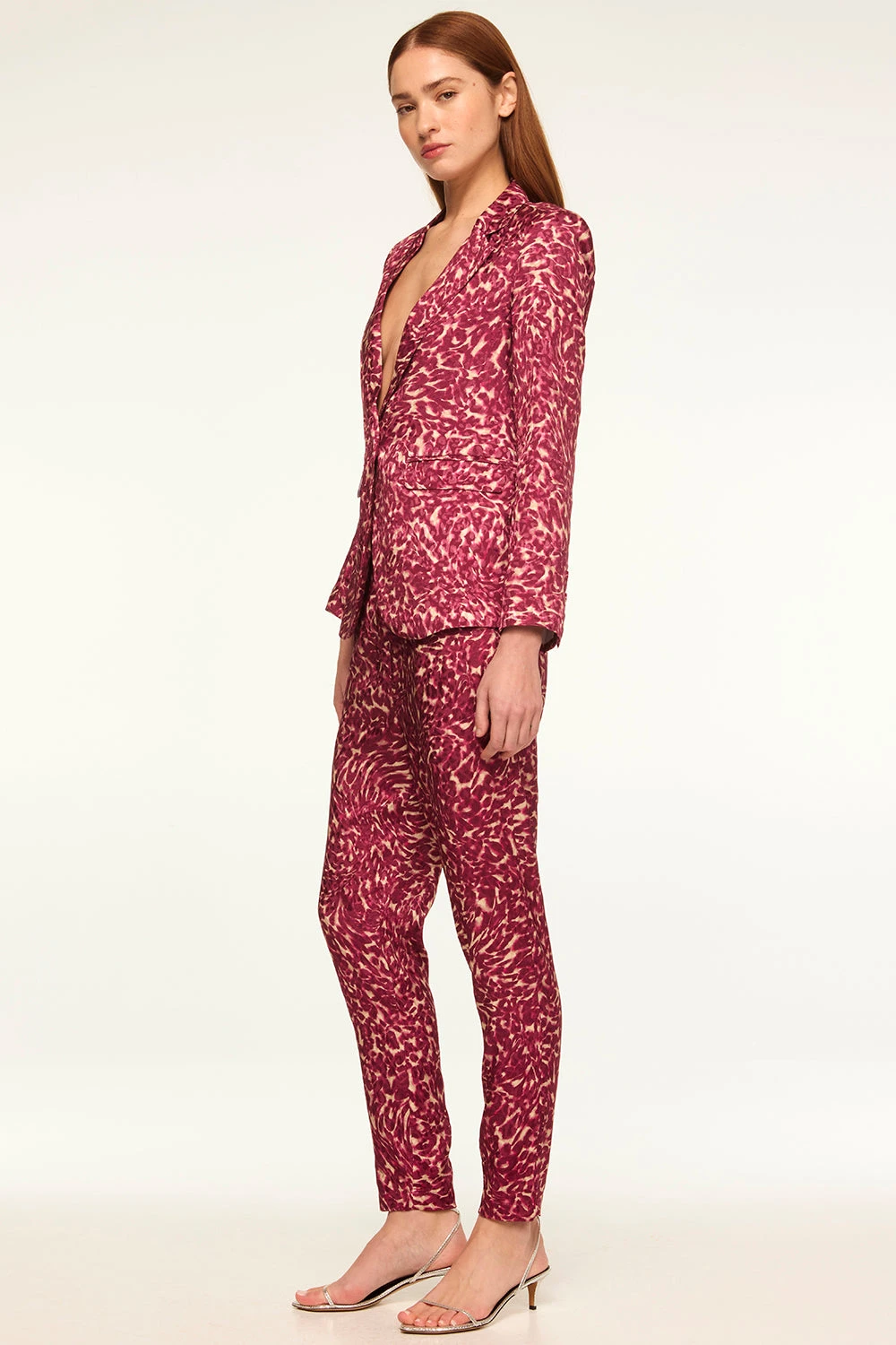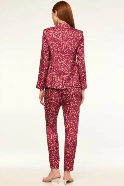 Our Georgina pant, cut from a gorgeous fuchsia leopard jacquard satin, features a tailored fit for a truly sophisticated style. A flattering elastic waistband and double side slit pockets. This flattering cigarette style pant pairs perfectly with the Catroux jacket for a standout holiday style.