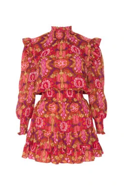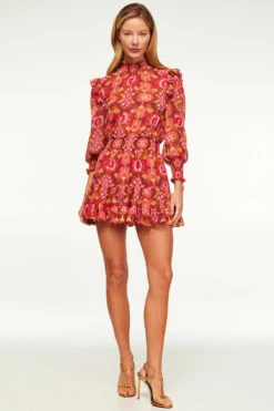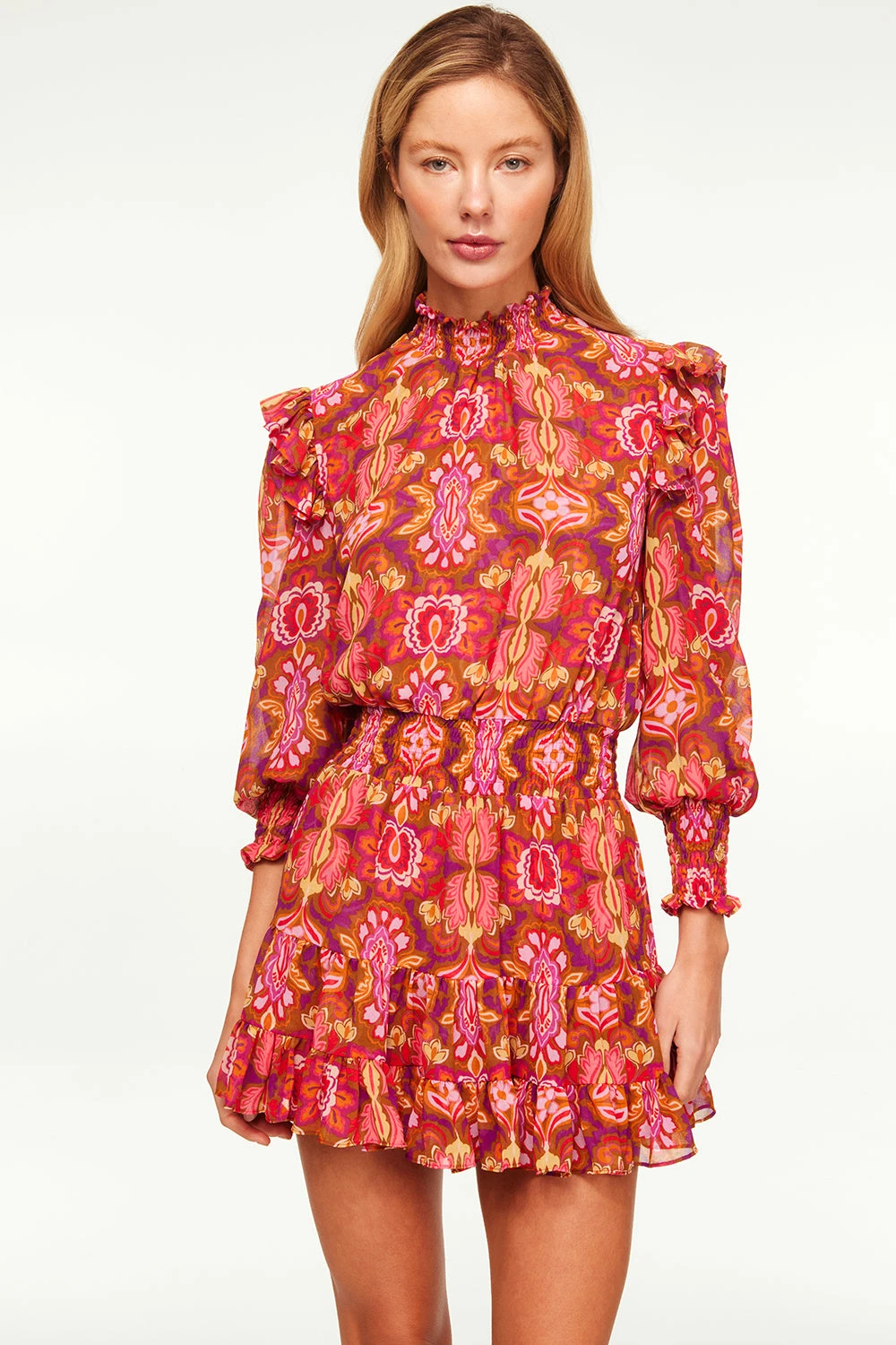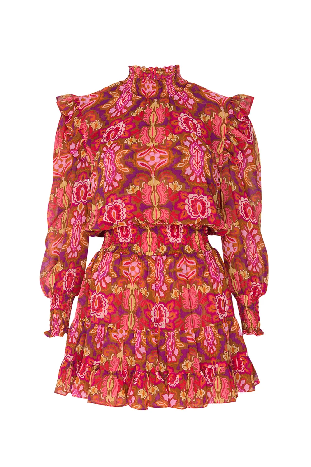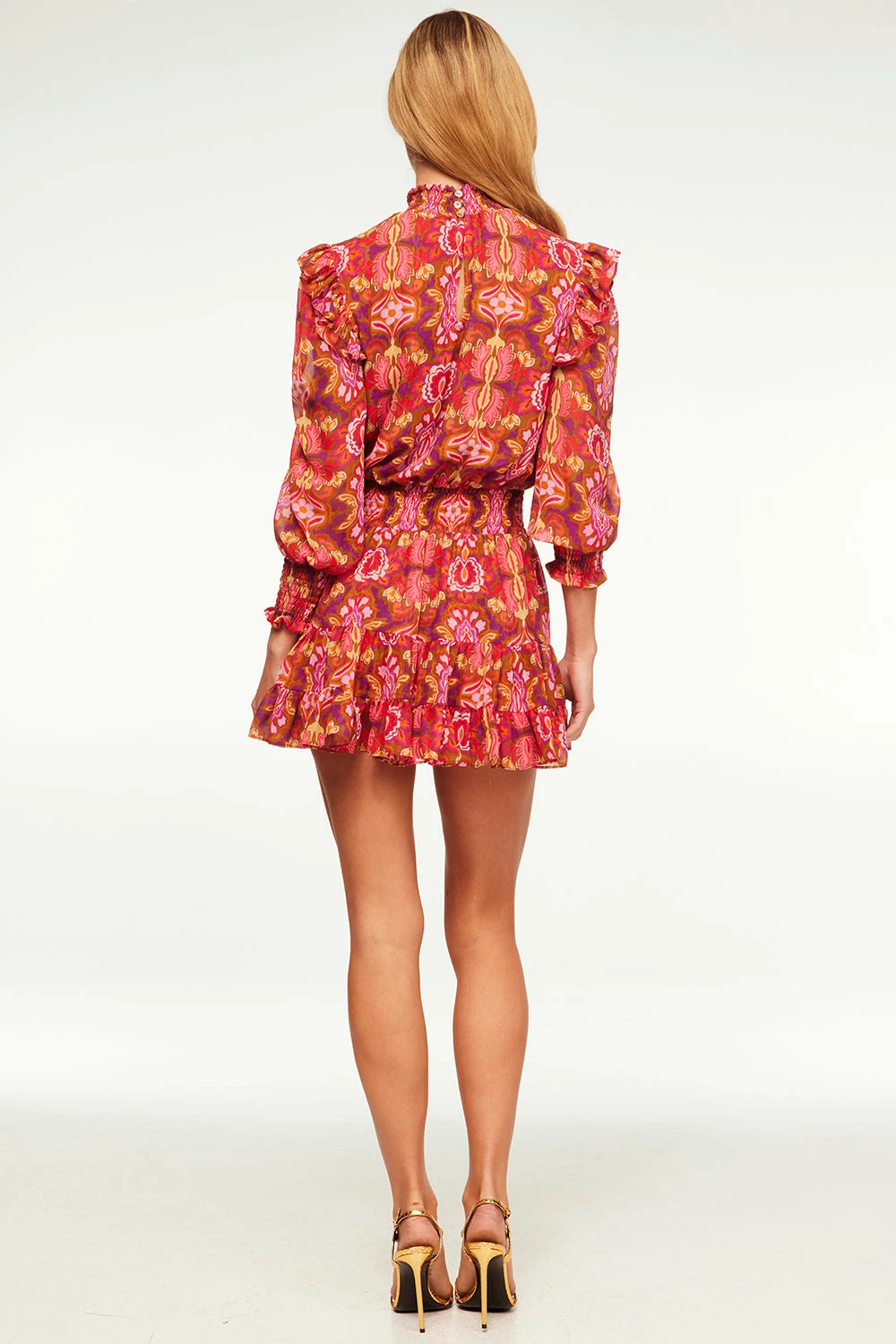 Gianna is an effortless mini silhouette handcrafted from a Chic Nostalgic printed chiffon in vibrant hues. This sophisticated style features a high, smocked neckline, long blouson sleeves with cuffs, and an elasticated waistline that leads into a tiered ruffle trimmed mini skirt.