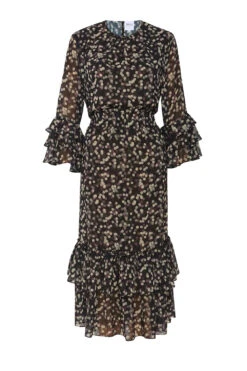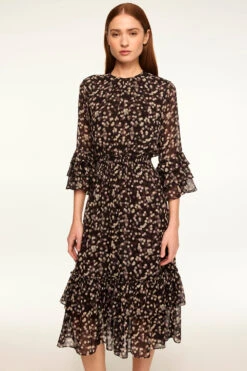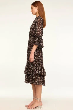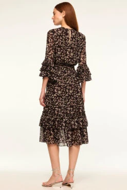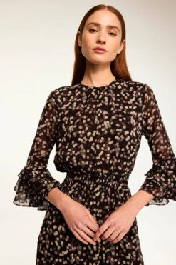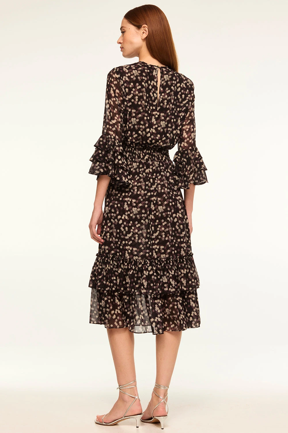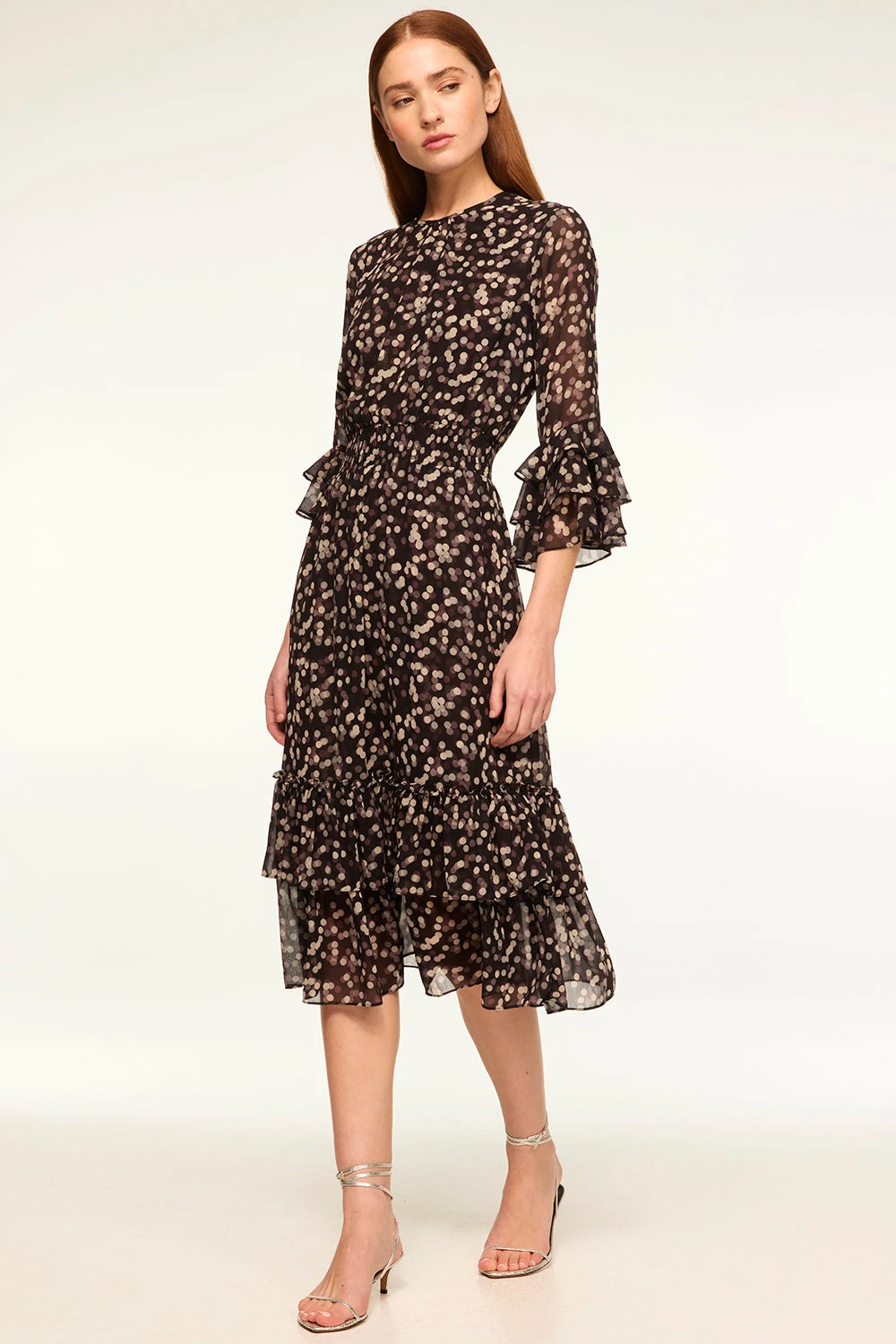 We brought back our best-selling silhouette. The Gordana dress is pure sophistication cut from a polka dot printed chiffon. The back features a keyhole with summary closure. Three-quarter semi-sheer sleeves are accented with a tiered ruffle detail at the cuffs. A covered elasticized waist flatters the figure and leads into a midi length skirt with a double ruffle hem. This versatile style seamlessly takes you from workdays to weeknights and weekend events.