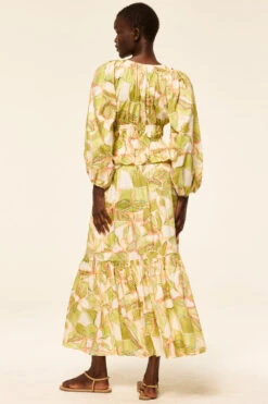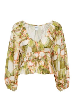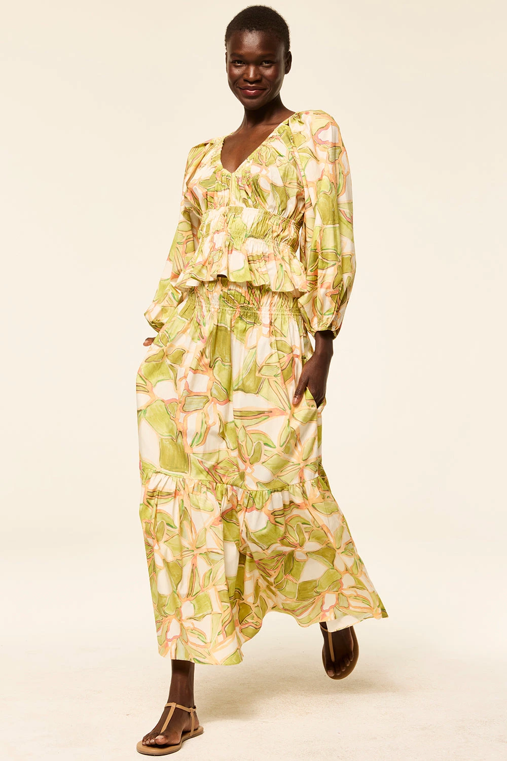 Halia is a versatile new top cut from a breezy Chartreuse Abstract cotton and featuring long blouson sleeves with elastic cuffs that can be worn on or off-the-shoulder for added versatility. A deep v neckline and elasticized ruching for a flattering waist detail. Poplin hem. Pair with the coordinating Elna skirt or Noah short.