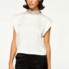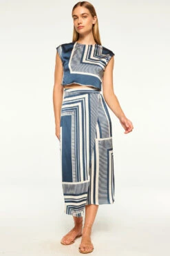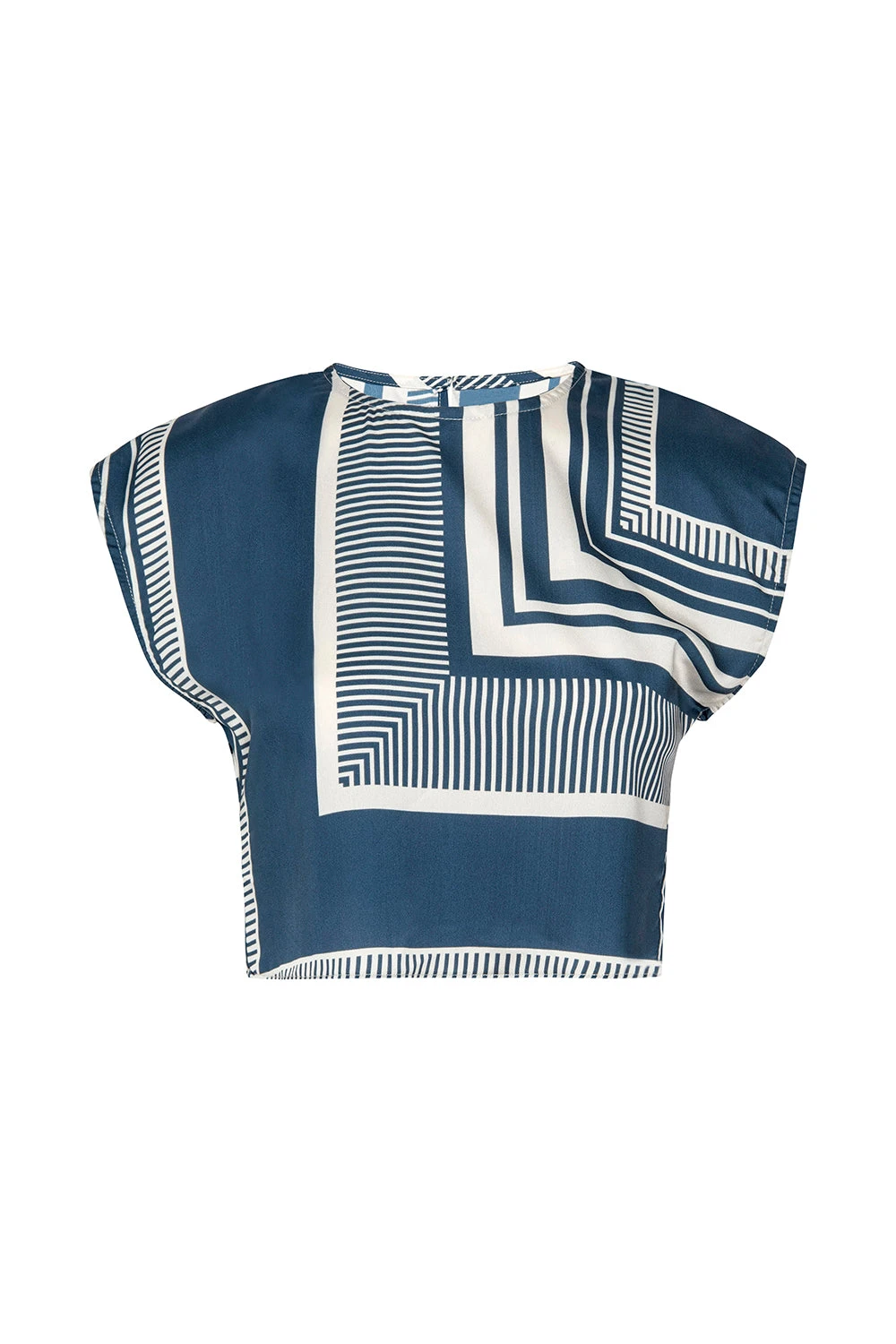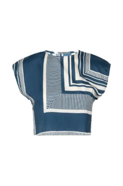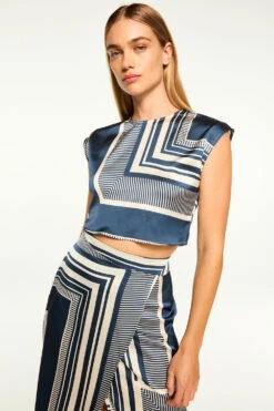 Hara is a sleeveless, cropped silhouette cut from our modern linear geo printed satin. Pullover style with a keyhole back-summary closure. Dress down with jeans or pair with the coordinating Nilla skirt or Reshma pant for a head to toe look.