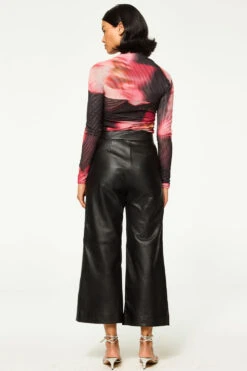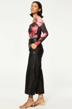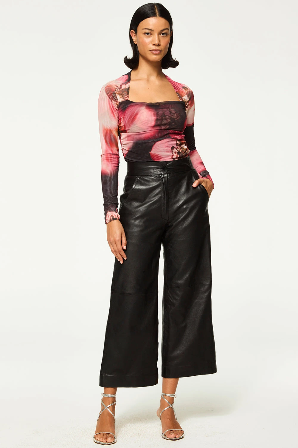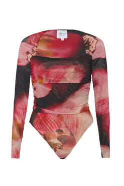 Our newest Hayworth bodysuit is cut from a midnight orchid graphic print mesh. Long sleeves and a flattering square neckline show off your collarbone and ruched stretch mesh hugs and flatters your curves. A snap-summary bottom closure and thong back. Pair with your favorite pair of jeans or with our Sierra skirt in black.
