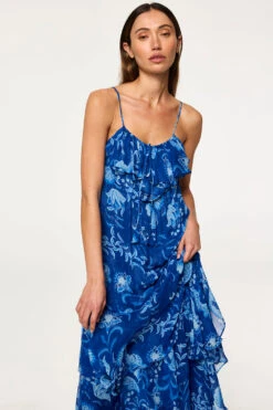 The Heaven dress is a flowing A-line maxi cut from vibrant Fiji Blue chiffon. Designed with adjustable spaghetti straps and an adjustable front tie neckline, this breezy silhouette is double lined for coverage and comfort. A triple-tiered, wide ruffle skirt adds movement and charm. Effortlessly versatile—dress it up with heels or down with sandals for any summer occasion.