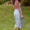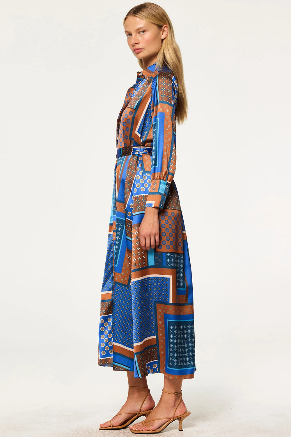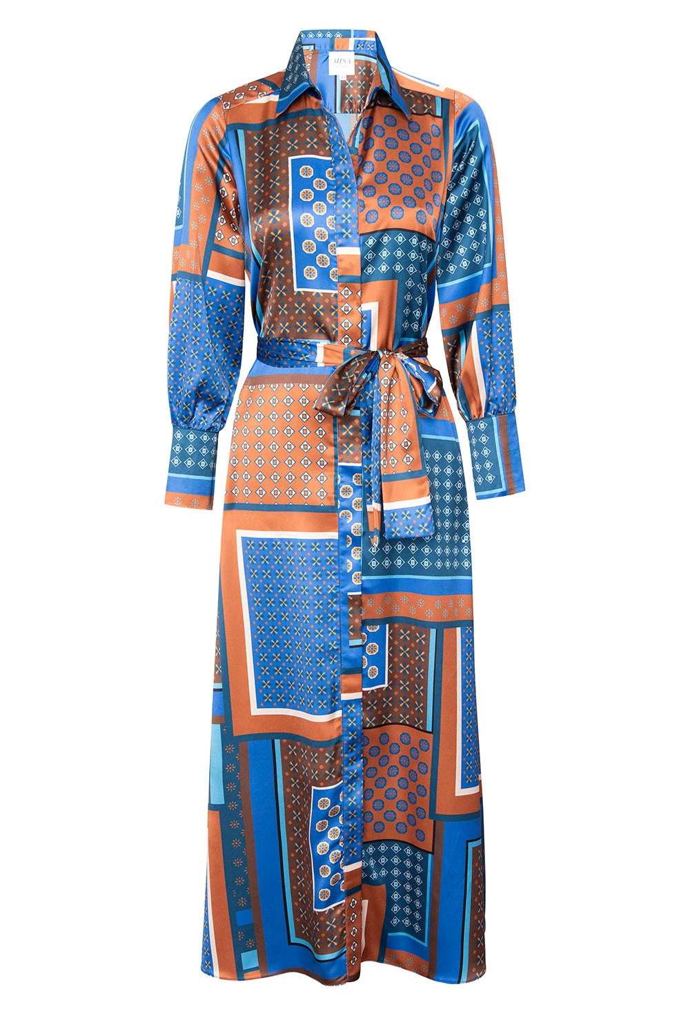Herminia is a chic shirtdress crafted from blue and brown Tile Patchwork satin for a refined yet striking look. This ankle-grazing silhouette features a covered summary placket, a classic fold collar, long sleeves with wide summary cuffs, and slit pockets. An optional self-tie belt offers styling versatility. A timeless piece you’ll reach for season after season.