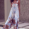 The Ilysa dress epitomizes effortless sophistication in a brown ditsy floral print chiffon. Ruffle-detailed cap sleeves complement the ruffle-trimmed placket with summary closure, while an elastic smocked waistband creates a flattering shape. The midi-length asymmetric skirt falls in cascading ruffles with an off-center side slit for movement. This classic MISA silhouette will carry you through this season and beyond.