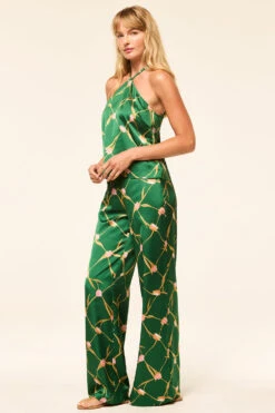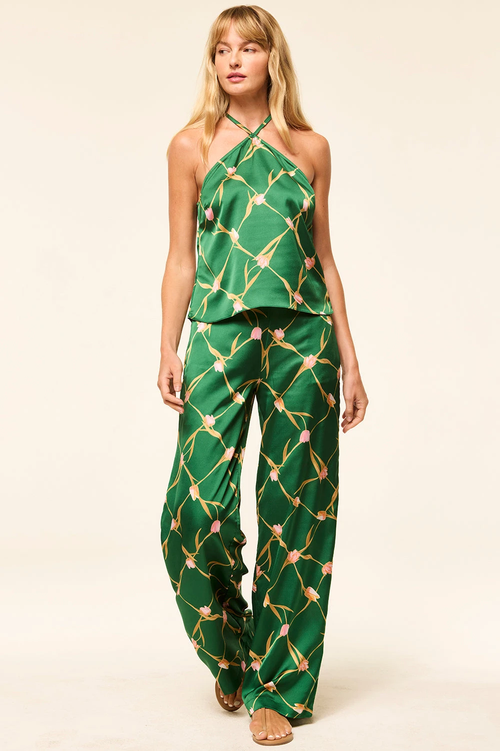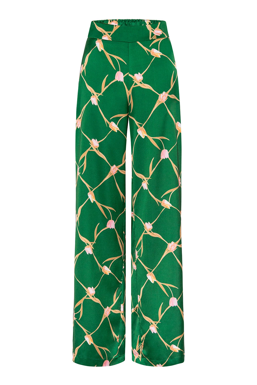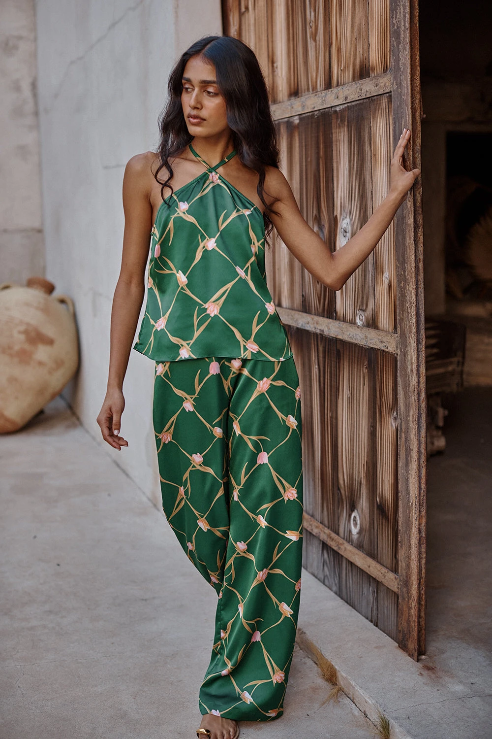 Izzie is a wide leg pant cut from our Tulip Lattice satin in a gorgeous green hue. Pull-on style with a flat band front and elasticated back. Side slit pockets. Opt for a head-to-toe look and pair with the coordinating Lina top.
