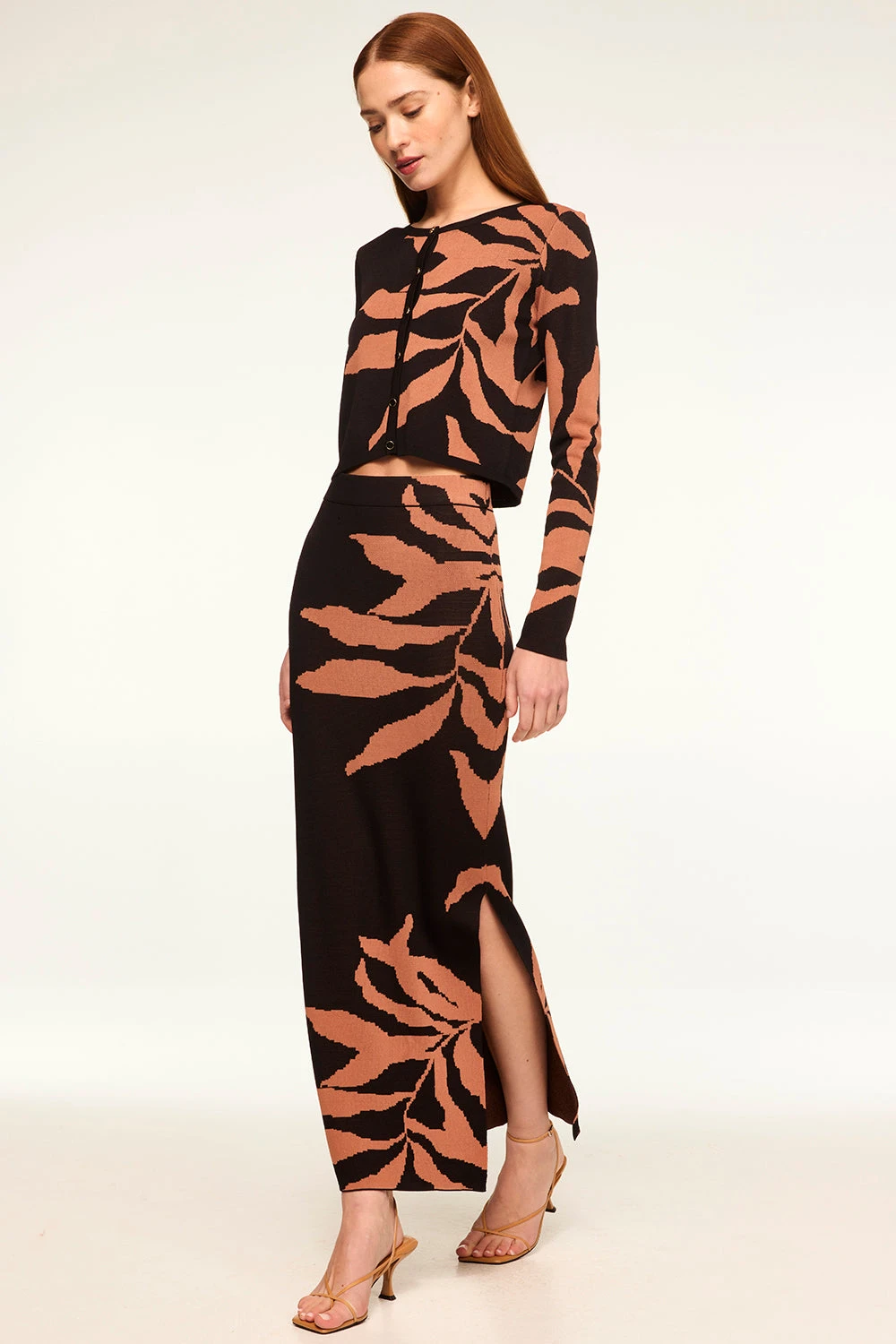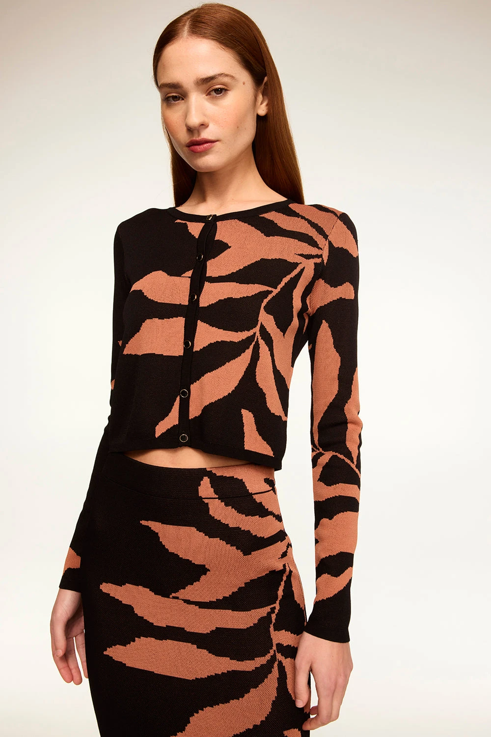 Our Joana cardigan is a beautiful jacquard knit in our Fernal Glow print. A fitted, slightly cropped silhouette fully summarys at the front and is finished with tonal, black enamel summarys. Wear with jeans or pair with the matching Fira skirt.