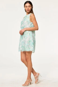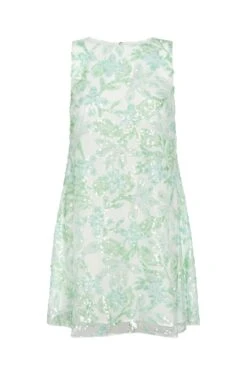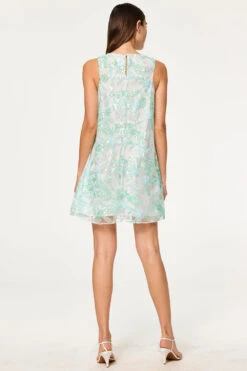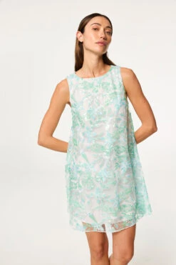 The Jonah dress is a sleeveless mini shift featuring glistening aqua floral appliqué on sheer mesh. Designed with a high neckline and keyhole summary closure at the back, it’s fully lined. Jonah is an easy, polished option for summer gatherings, evening dinners, or any special moment.