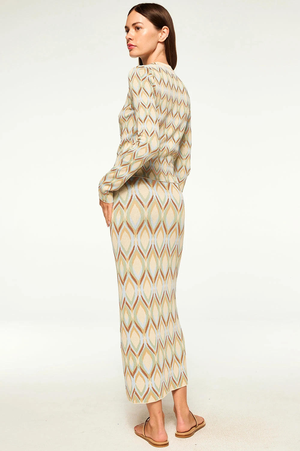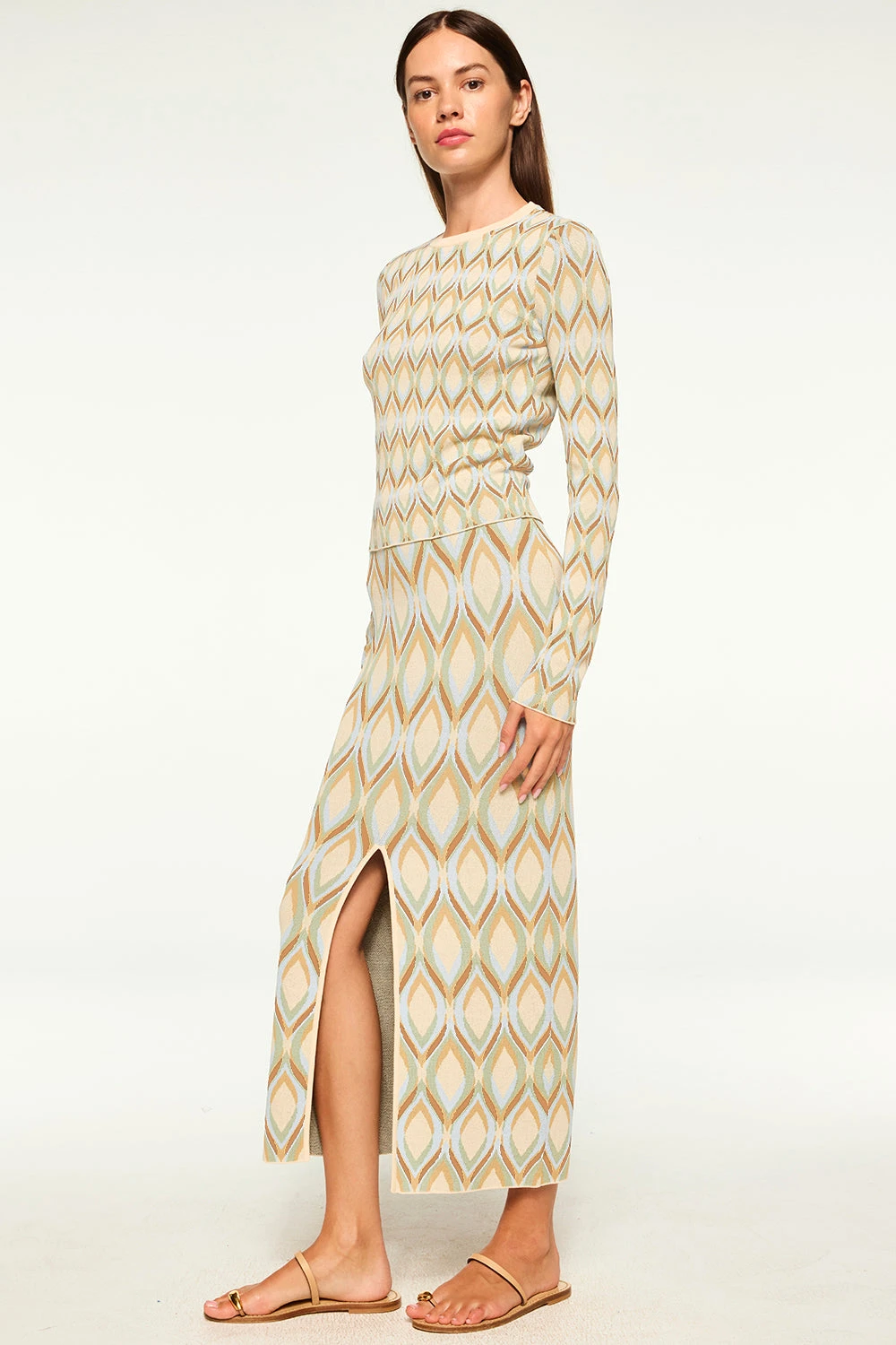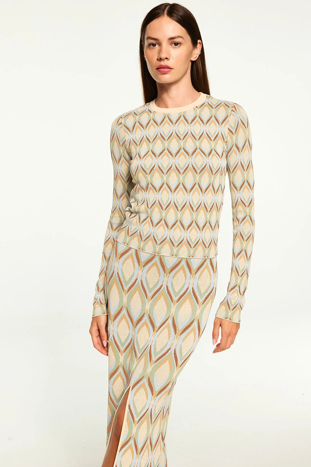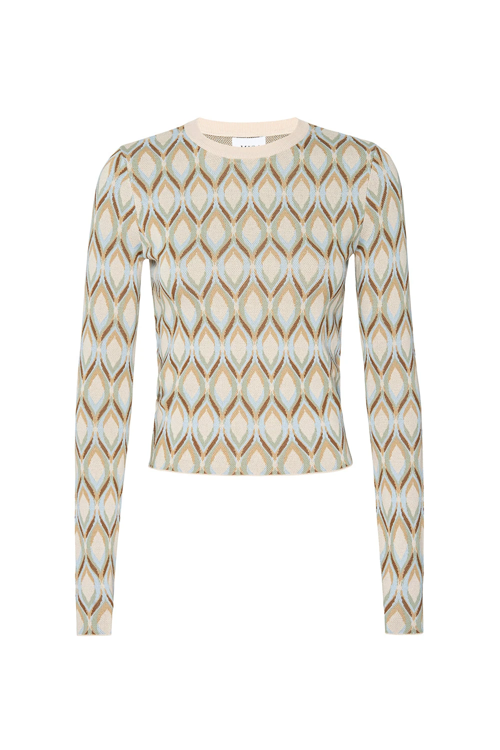 Our Joyce top is a simple long sleeve silhouette in a stretch, cream, knit jacquard. Fitted with a high crew neckline. Pair this easy style with your favorite denim.