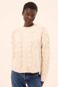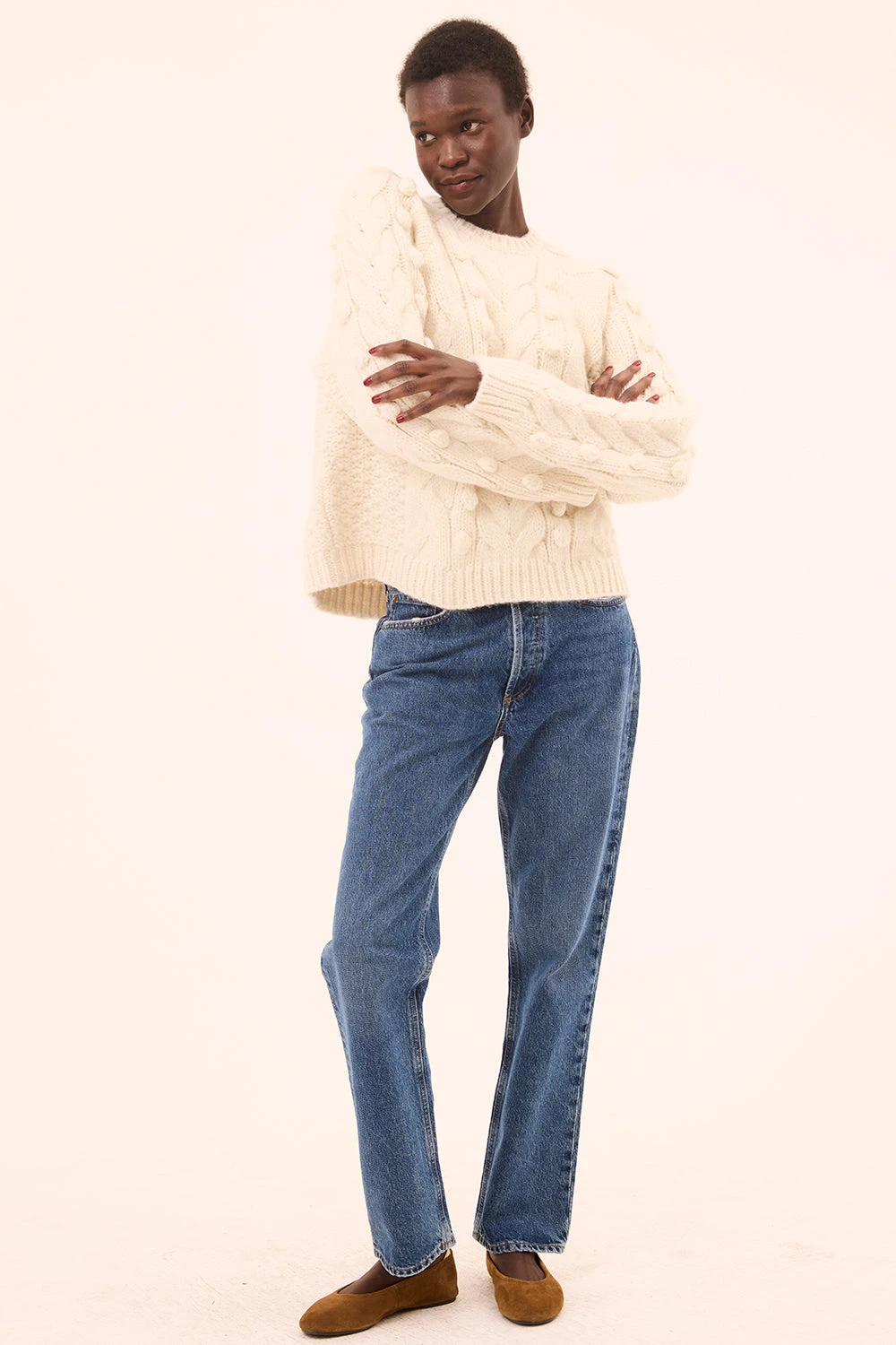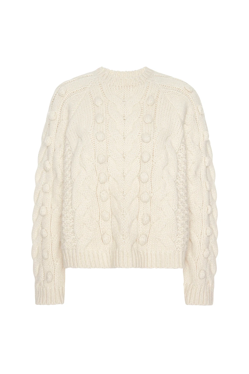 The Julissa pullover is made from soft alpaca wool with a cozy cable knit and playful pom-pom details. It features a curved hem that hits at the hip, along with ribbed cuffs, hem, and neckline. This shorter, relaxed-fit style is perfect for layering or wearing on its own.