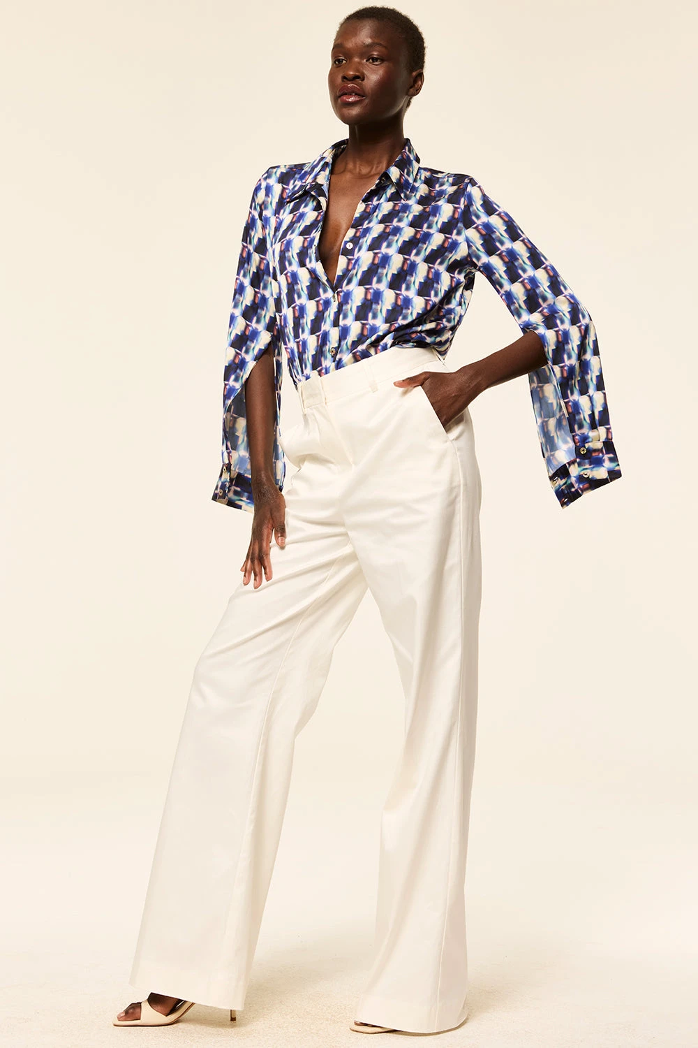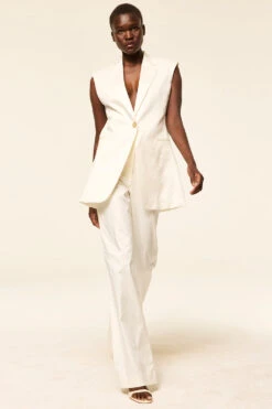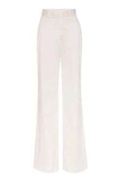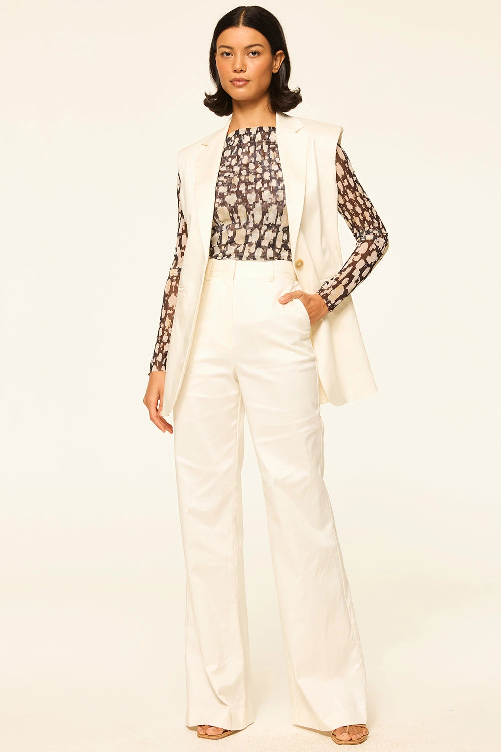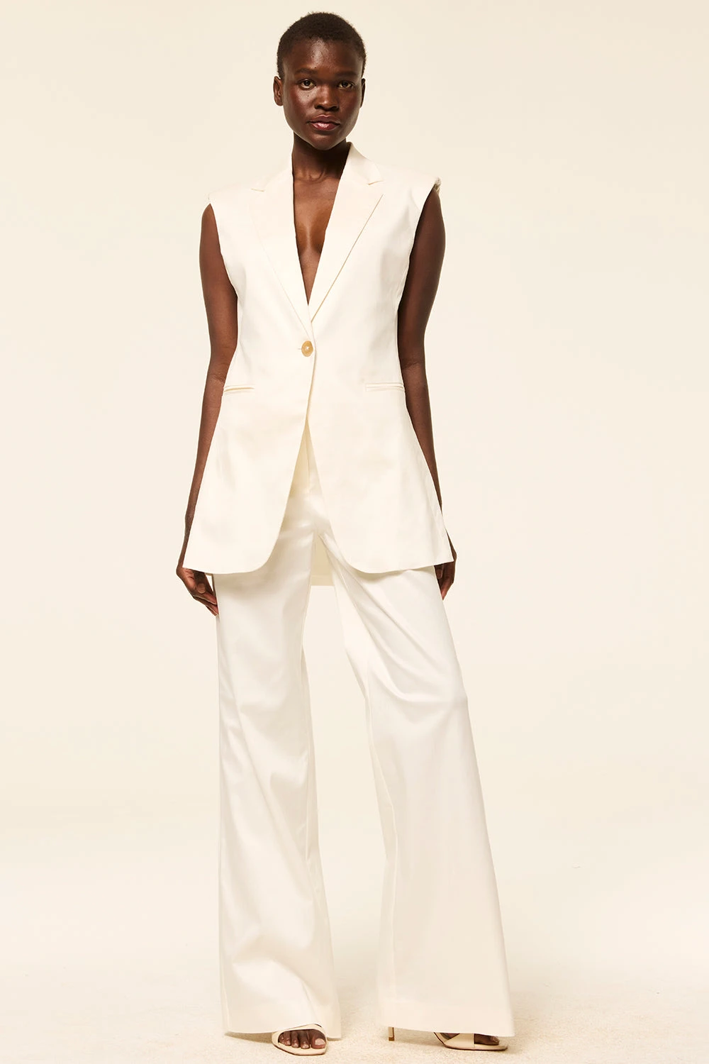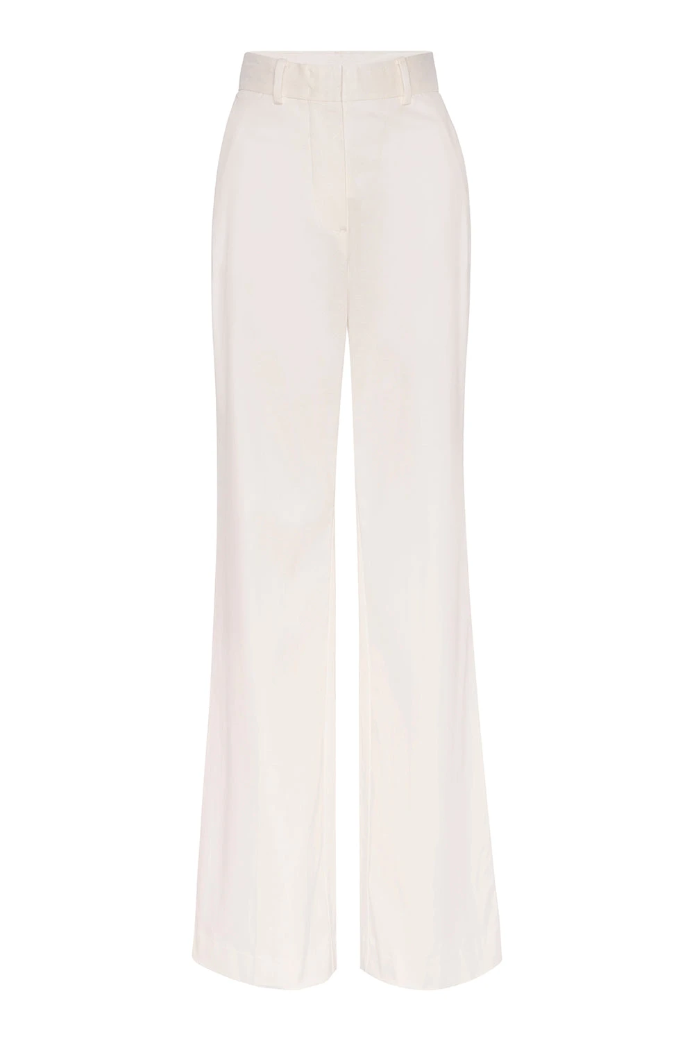Part of a chic suit, the Juno pant is cut from a white cotton blend and features a high waist and long wide legs. Covered front zip with hook and eye closure and belt loops. Front slant pockets. Pair with the Delia vest for the perfect spring suit.