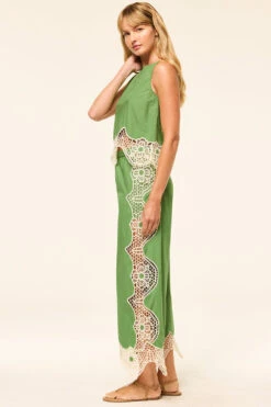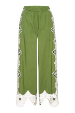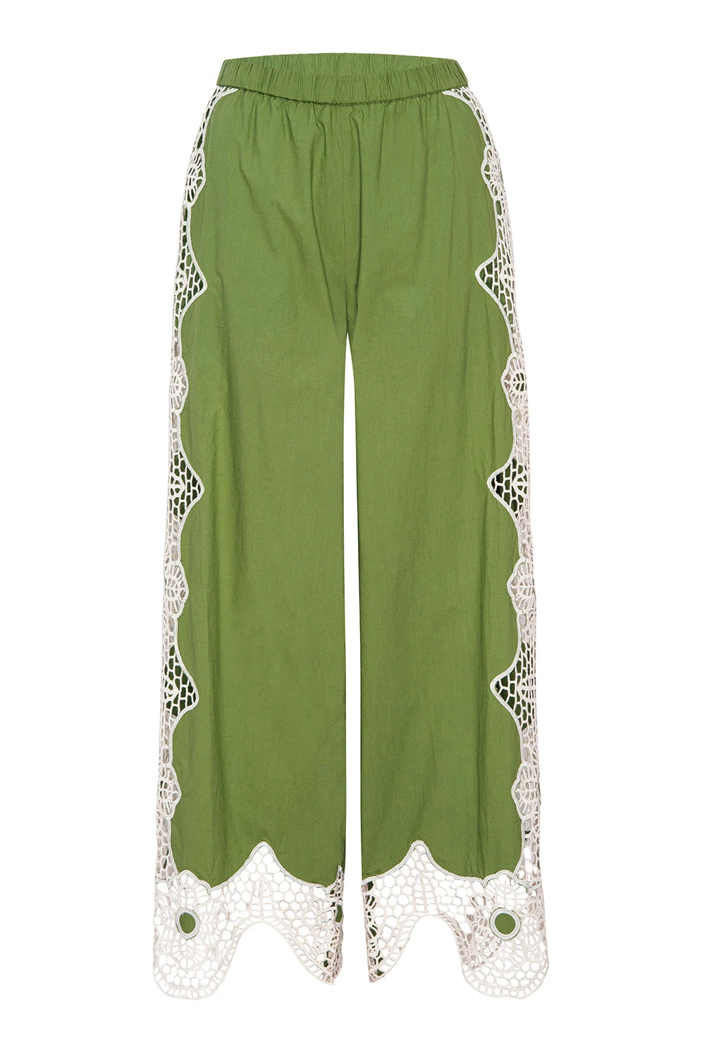 Our cropped Kalina pant is cut from a fresh green cotton poplin and features gorgeous ivory lace embroidered details on the sides and hem. Partially lined. Pair this culotte style pant with the coordinating Nola top for a standout spring set.