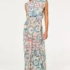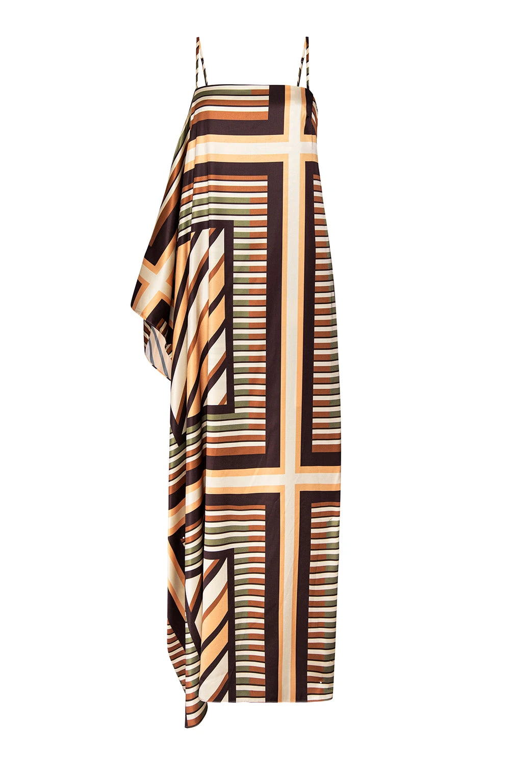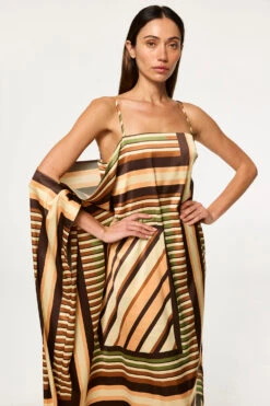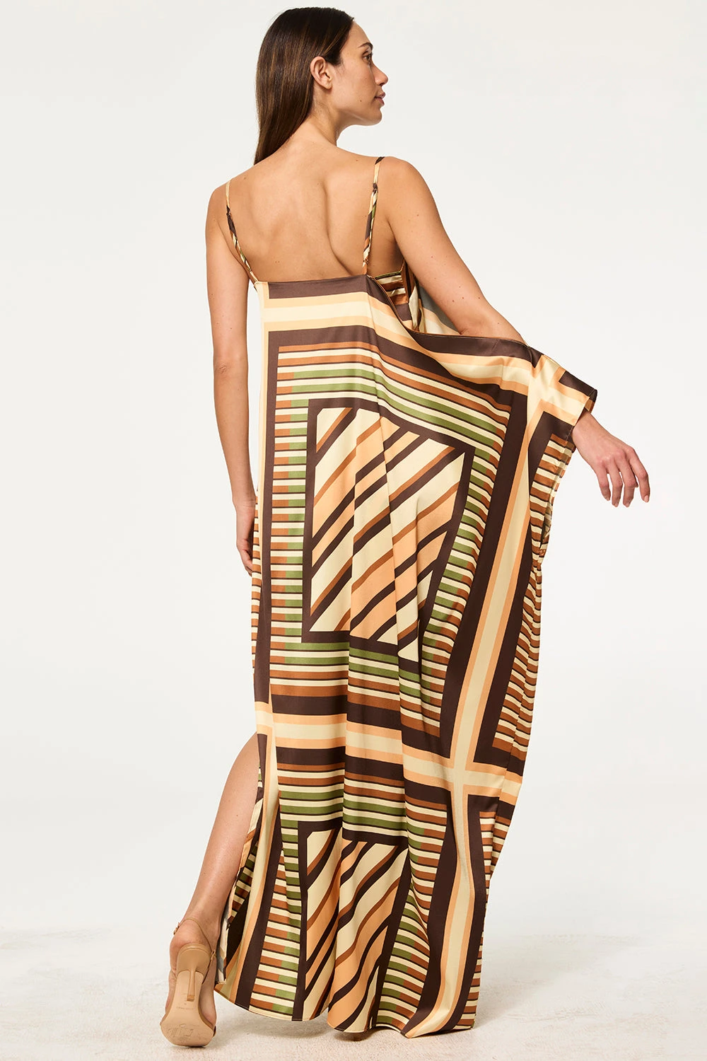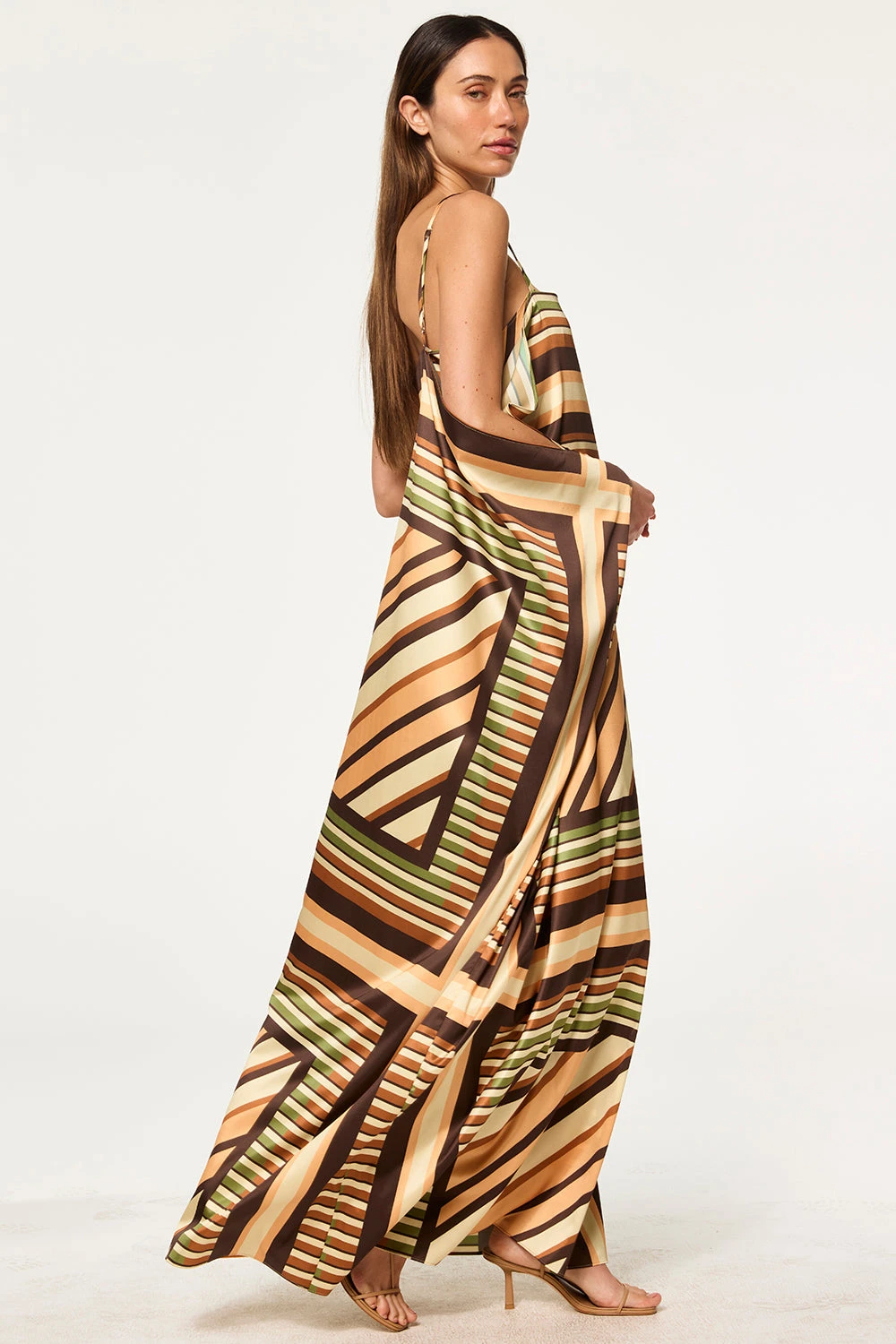 Kalissa is an event-ready maxi slip dress in a striking Geo Scarf print. Designed with a straight neckline and adjustable spaghetti straps, it features a dramatic draped kimono sleeve with a bold cutout that runs the length of the dress’s side. A side slit adds fluid movement. A true statement piece for summer occasions.