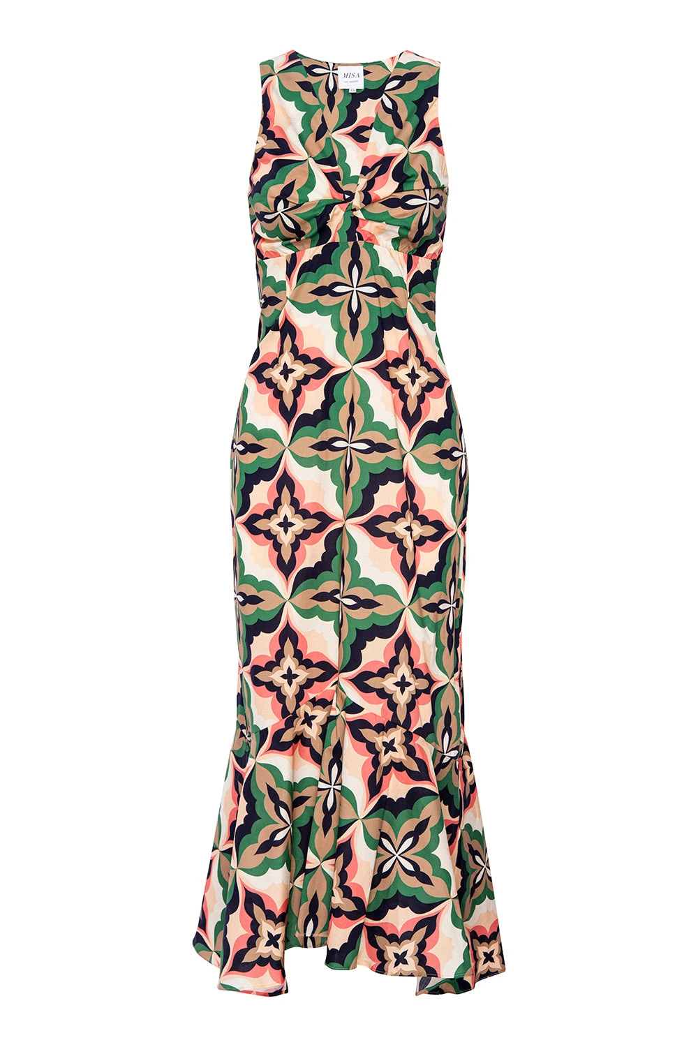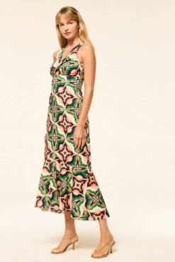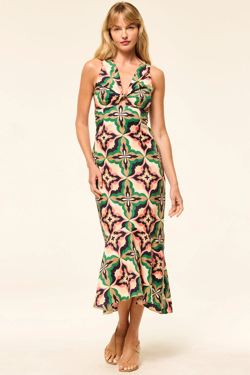 Keturah is a figure-skimming midi cut from stretch cotton in our vibrant Prismatic Tile Coral print. This sleeveless silhouette features a twist-front neckline with a subtle keyhole detail and a hidden side zip for a smooth, flattering fit. Finished with a flounced hem, it’s an easy piece to dress up with heels for any occasion.