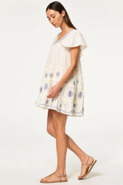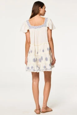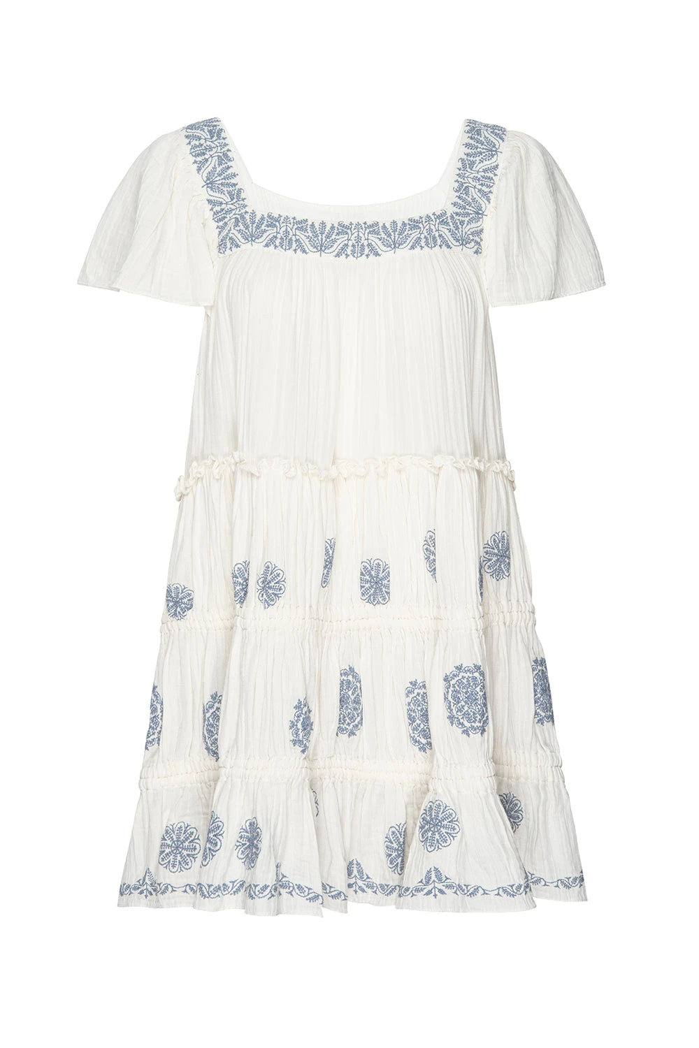Kiran is a breezy cotton gauze mini for your next warm-weather getaway. A square neckline and back trimmed with blue embroidery leads into this babydoll silhouette with delicate ruffle trimmed tiers featuring a blue embroidered medallion motif. Short flutter sleeves. Lined.