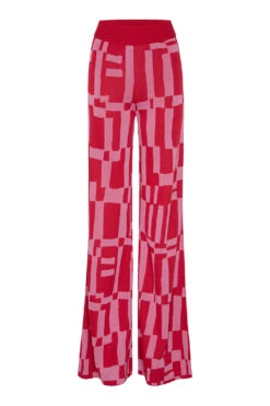 Our new Koa pant is a knit fit and flare style in a bold two-tone pink and red geometric pattern. Featuring a wide banded waist. Fitted through hips and legs leading into wider slightly flared legs. Pair with the coordinating Elva cardigan and Una top for a head to toe statement.