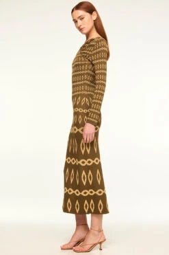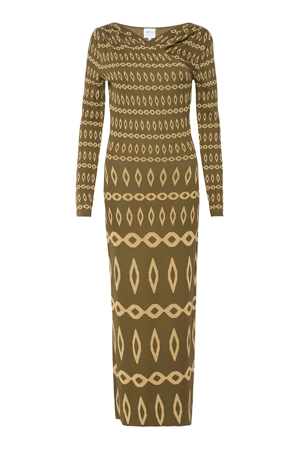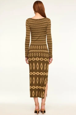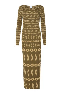 Our new Lainey dress is a body-hugging stretch knit jacquard dress in a flattering olive geometric pattern. A v crossover neckline features a flattering gathered detail at the shoulders and leads into long fitted sleeves. A fitted bodice and midi length fitted skirt. Pair with boots or heels for the perfect transitional look.