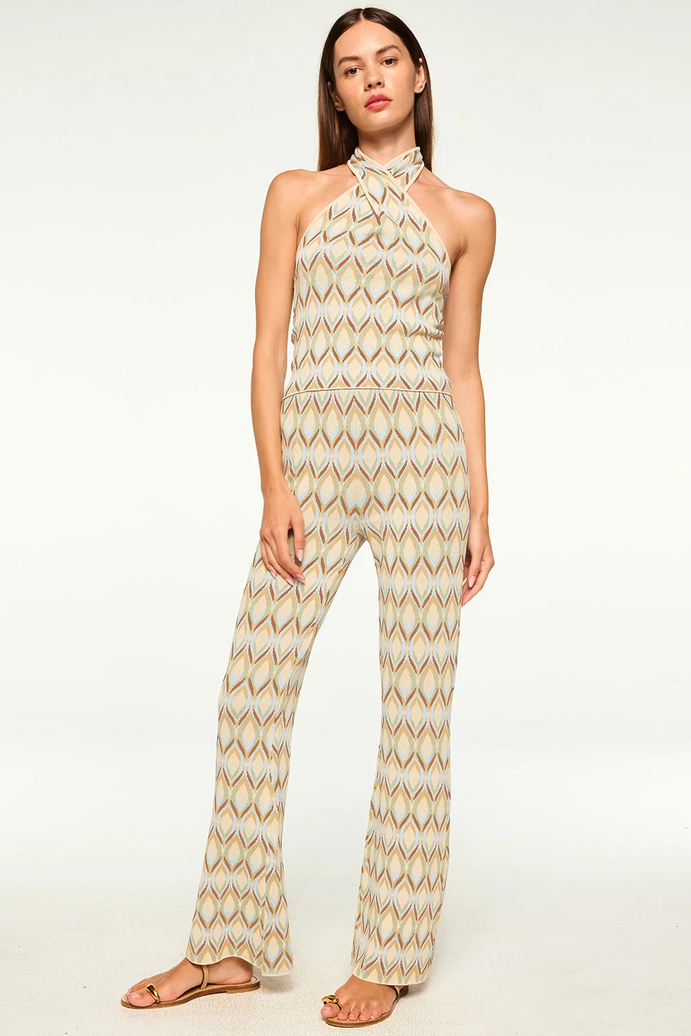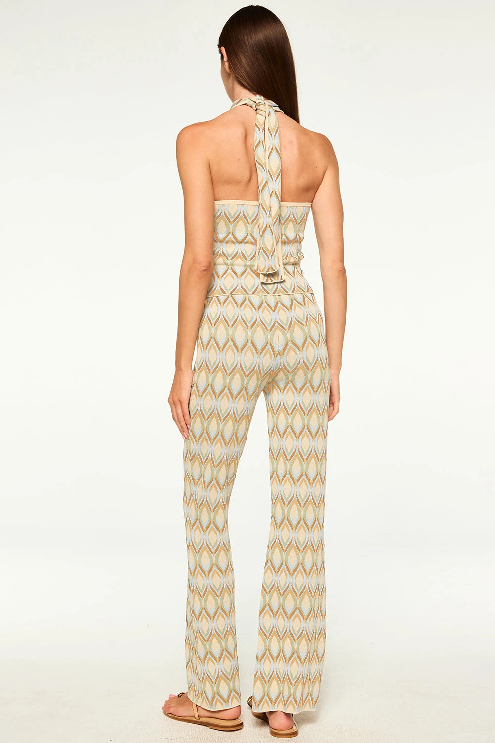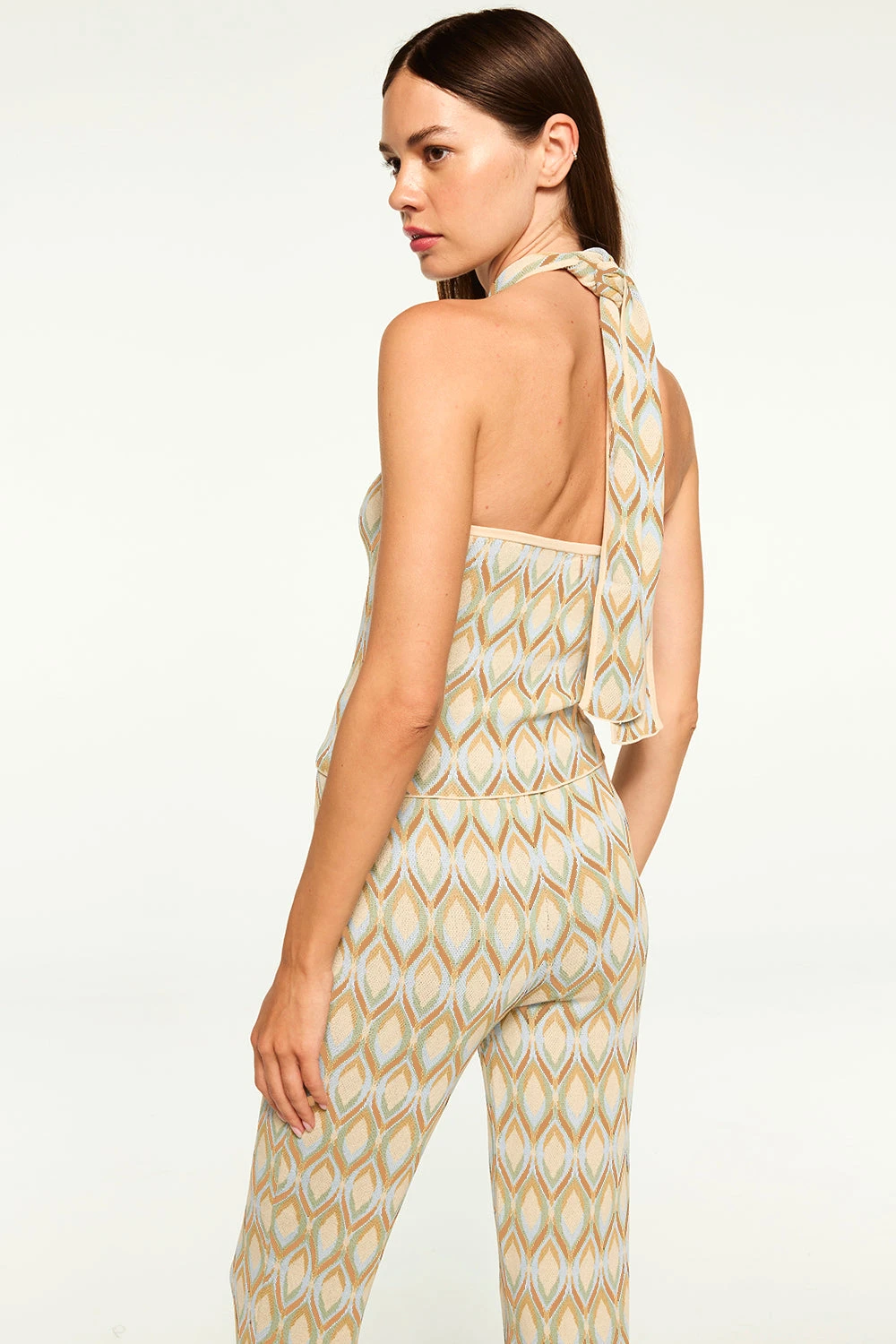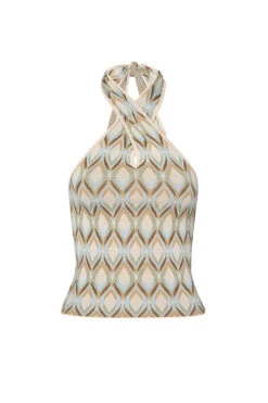 Leah is a fitted halter-neck top in a chic cream print jacquard. This stretch knit features an open back and twist neck detail with tie-back closure. Pair with jeans or complete the set with the coordinating Roura pant or Rowen skirt.