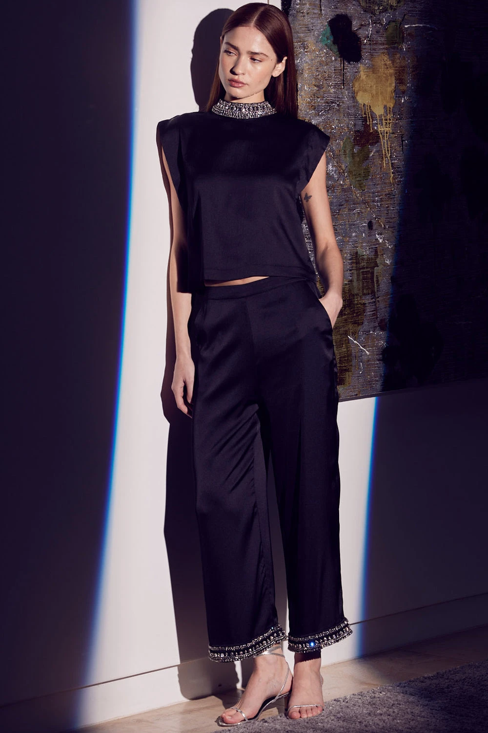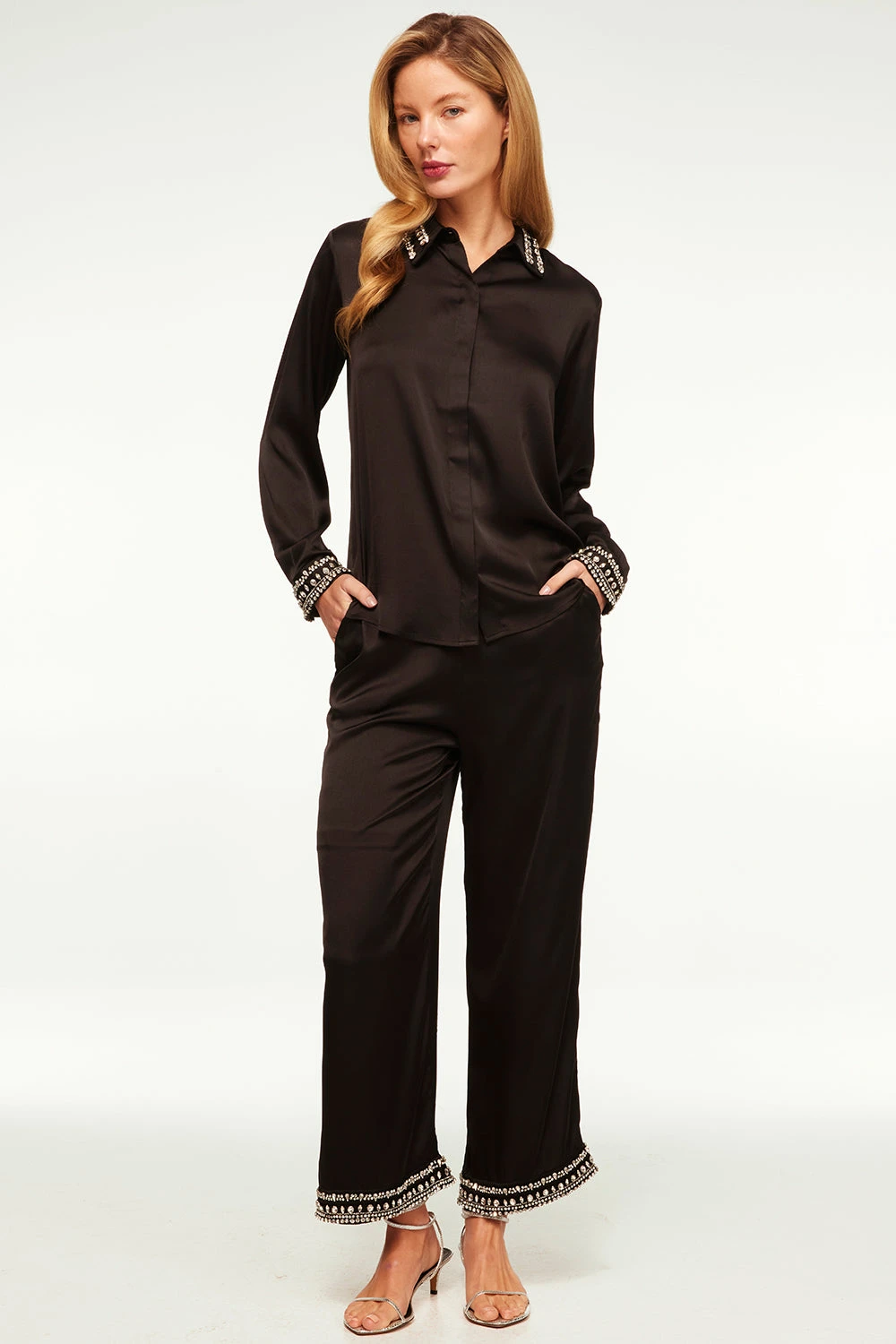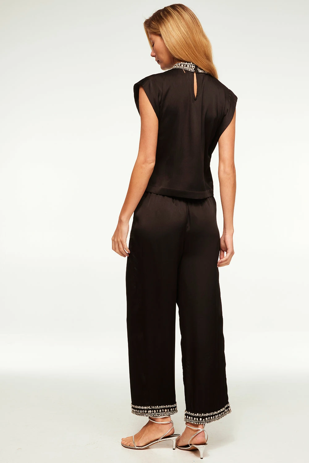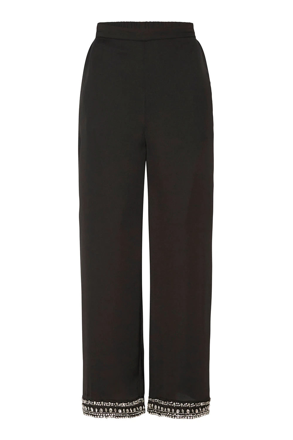 Elevate your seasonal wardrobe with the chic Leia pant in black satin. This cropped pull on style features a flat front and elasticated back waist for an easy fit. Double side slit pockets and flattering cropped wide legs feature a sparkling crystal embellished hem. Pair with a cozy, oversized sweater or with our coordinating Ellie or Riley tops.