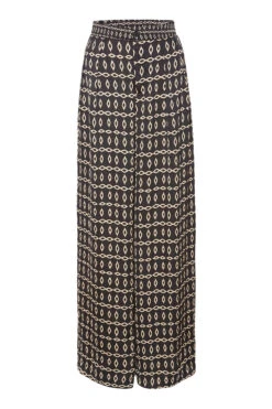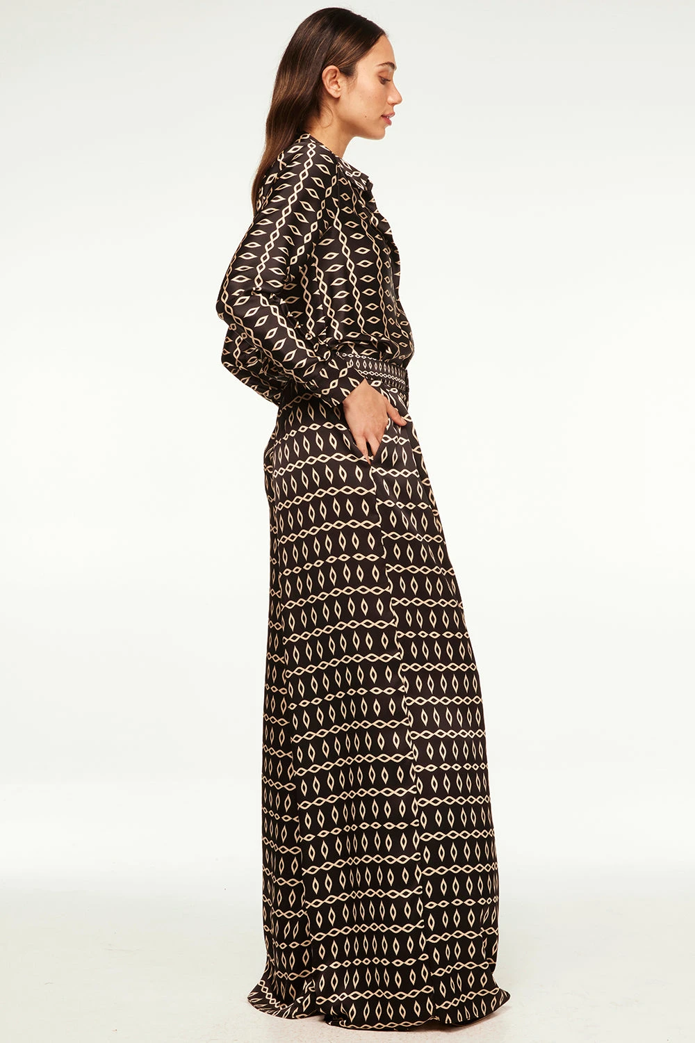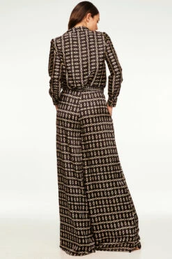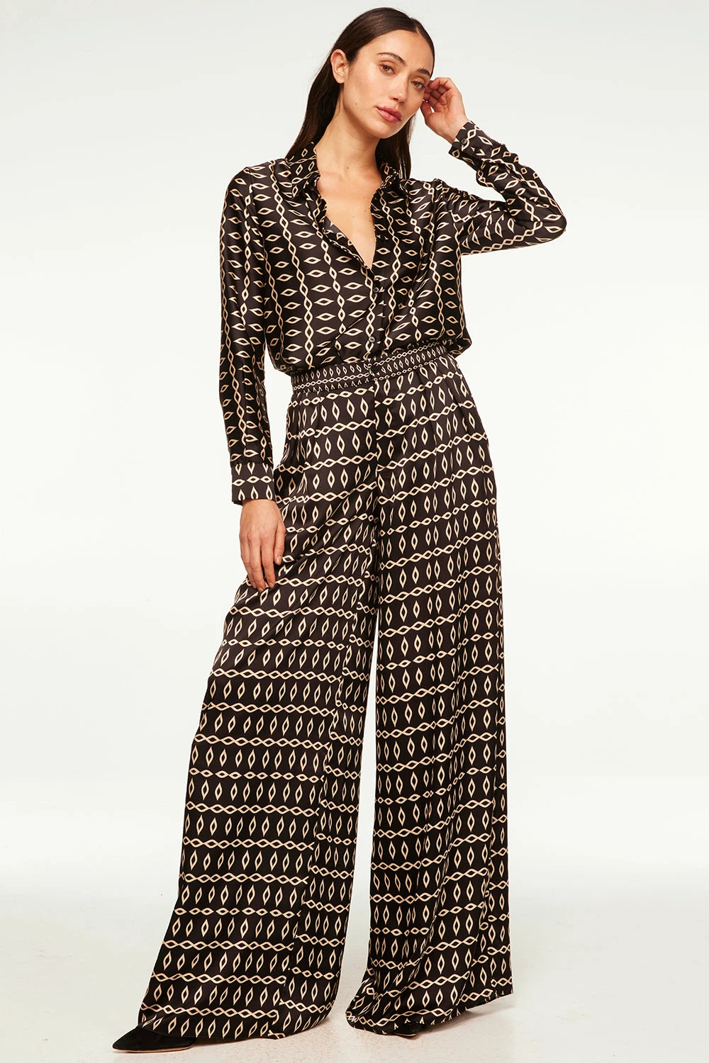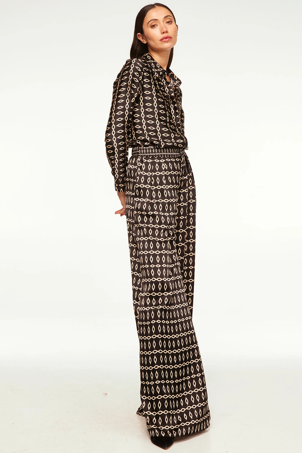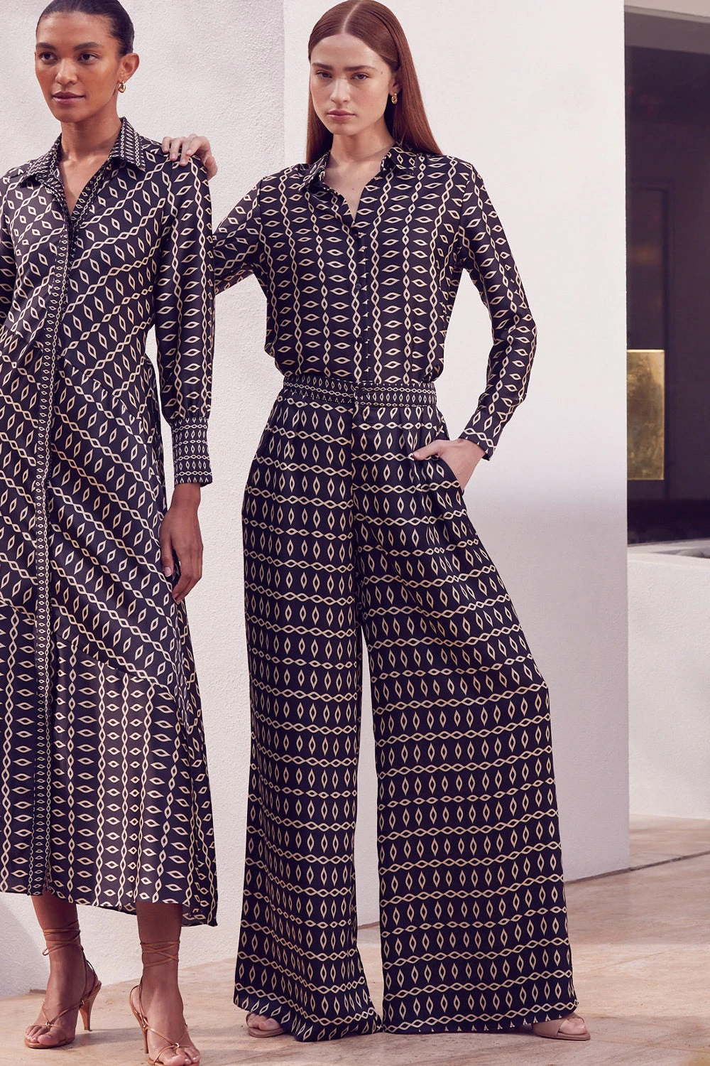 Our Lemor palazzo pants are cut from a Go West Geo printed black satin. High rise with a hidden zip and tab summary closure. Side zip pockets and wide legs with a floor-length hem. Pair with the coordinating Celine top for head to toe chic.