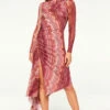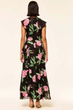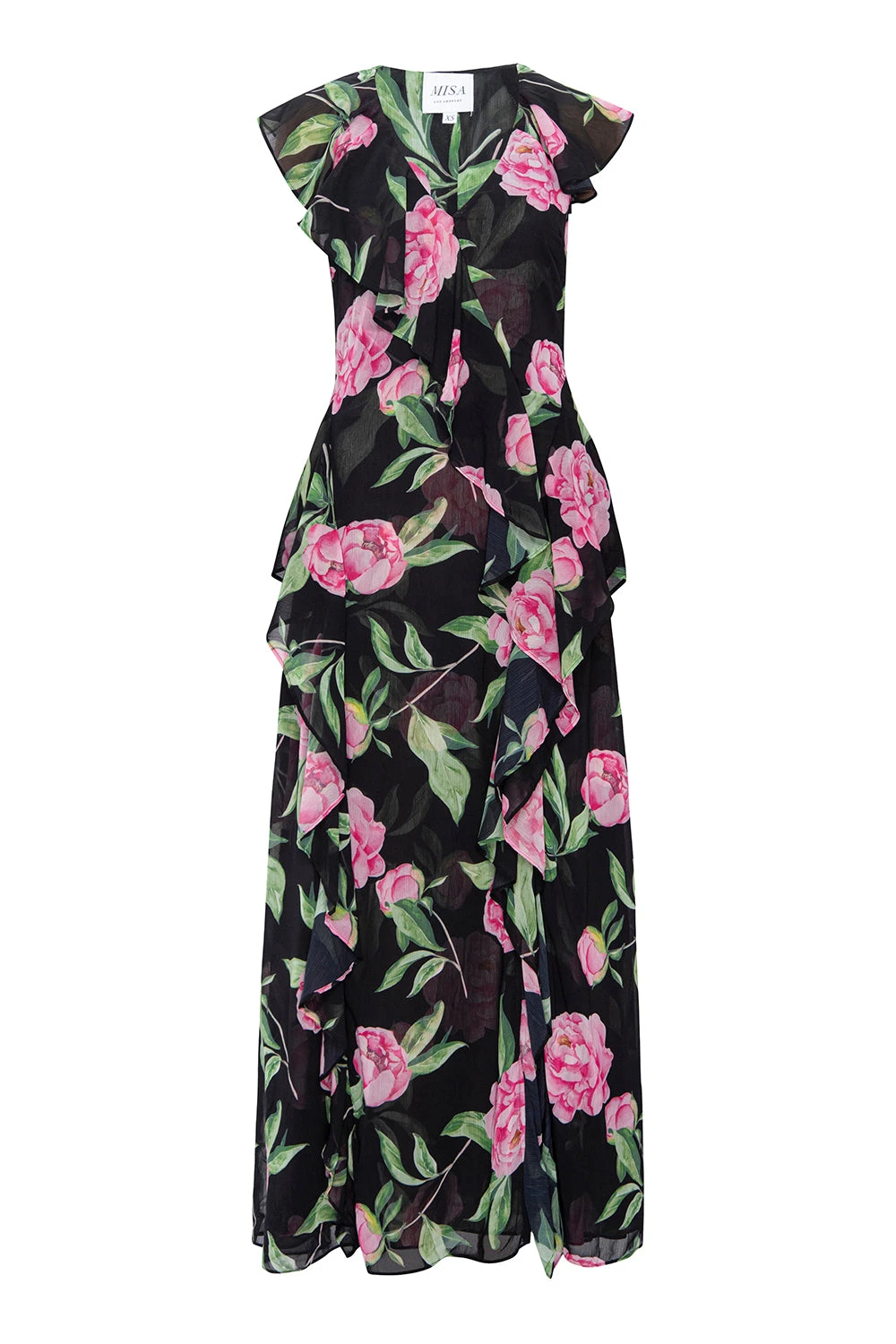 From weddings to showers and beyond, our new Lilith maxi dress is the perfect piece for every occasion this season. Cut from a gorgeous Pink Peony printed chiffon, this ankle grazing style features a V neckline adorned with a feminine ruffle that crosses diagonally over the bust meeting at the front slit. The waist is accentuated with a peplum ruffle. Double lined with a hidden side-zip closure.