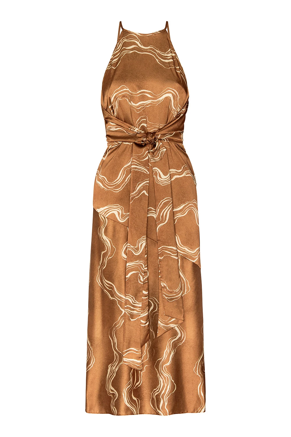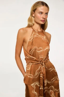Lisa is a brand new halterneck midi silhouette cut from our Linear Wave printed satin. A back panel wraps around to be tied in the front, creating a flattering, cinched waist. Finished with a back keyhole summary at the neck, side slit pockets, and a diagonal seam that leads into a flowing skirt with a side slit, it’s a perfect dress for your next event or easily dressed down with flats. A versatile style that transitions beautifully from summer into fall.