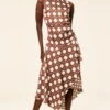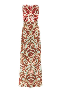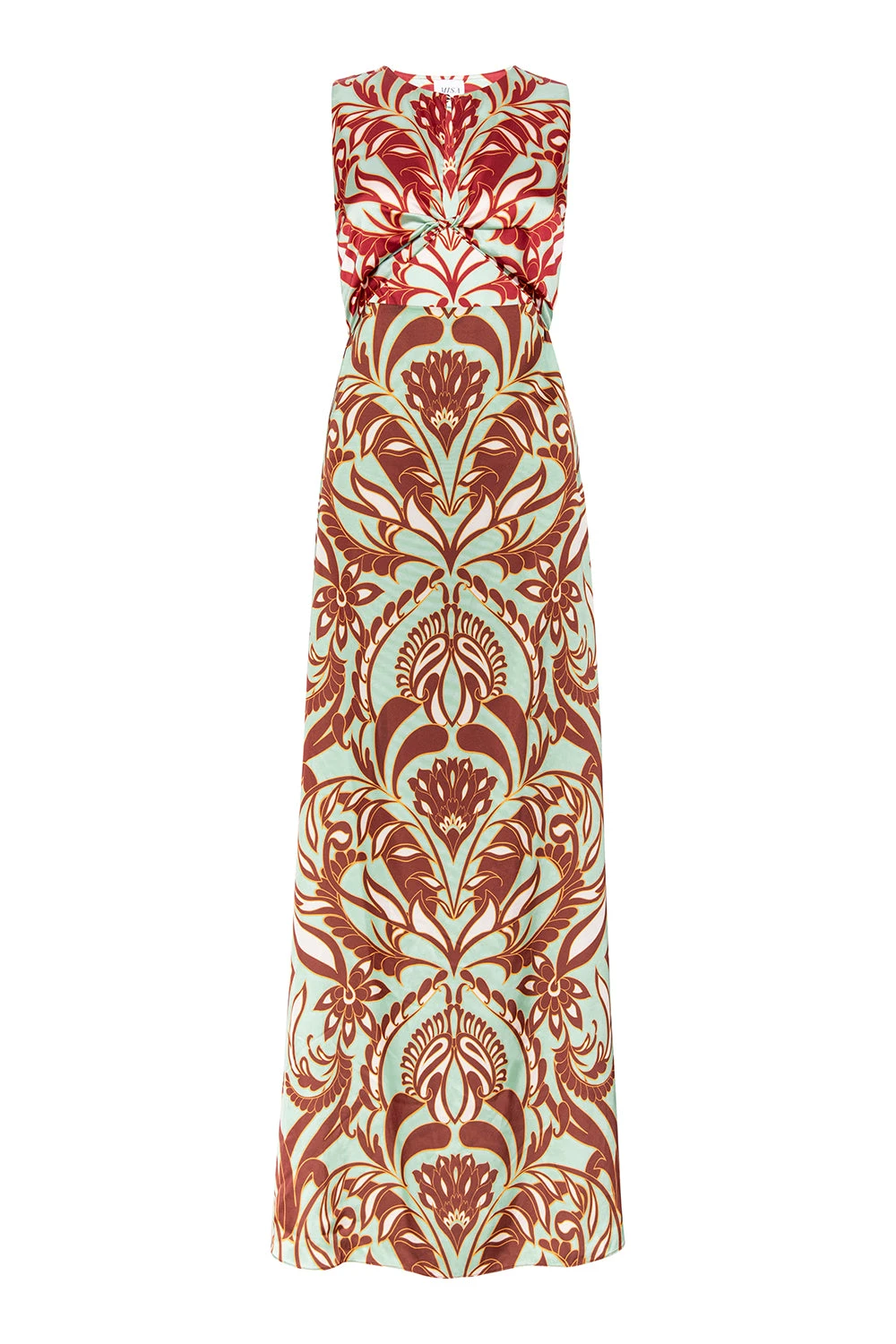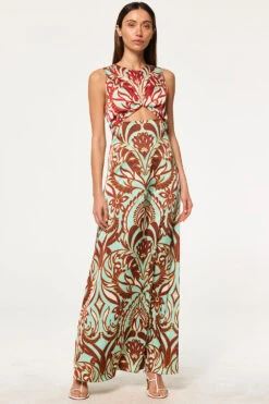 The Louanne dress is a stunning satin maxi in a mixed Vintage Botanical print, designed to turn heads. Sleeveless with a high neckline, it features a twist keyhole detail and a triangle cutout just above the waist. The top is rendered in mint and rust, while the fluid skirt flows in mint and umber for a striking contrast. Finished with a hidden side zip, Louanne is the perfect dress for summer weddings and special events.