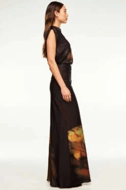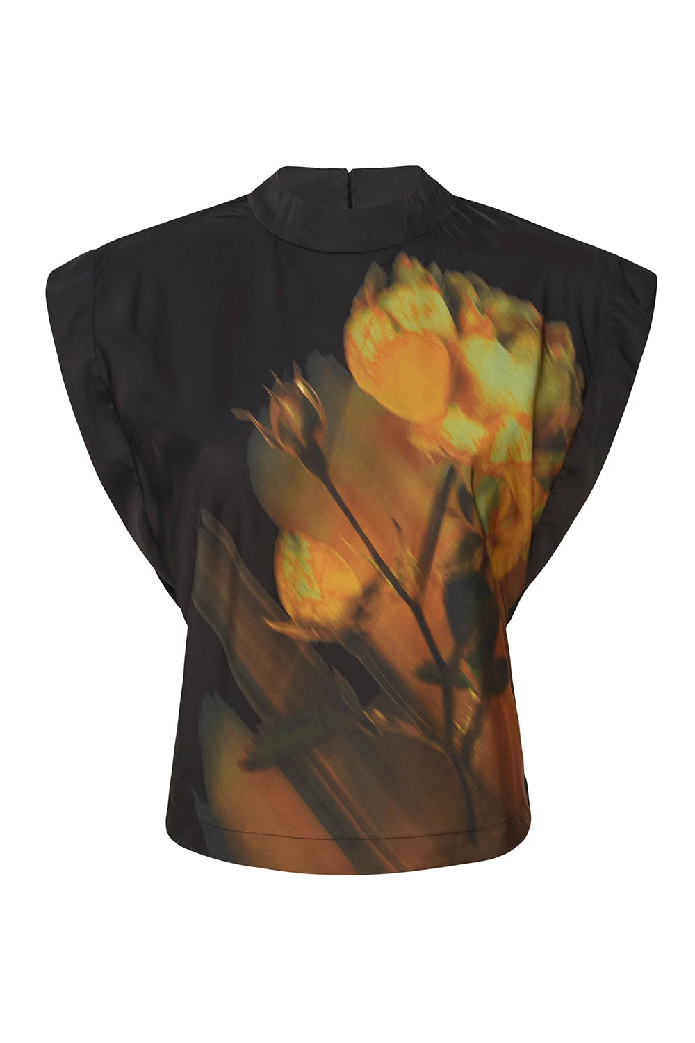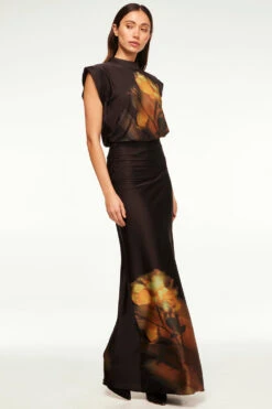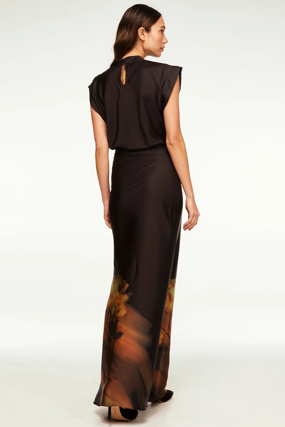 Our Lucy top is a a satin blouse with a beautiful blurred yellow rose printed on the front. Featuring short dolman sleeves, a draped fit, high neckline and summary keyhole closure back. Pair with the coordinating Sierra skirt for a sophisticated set.
