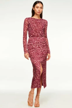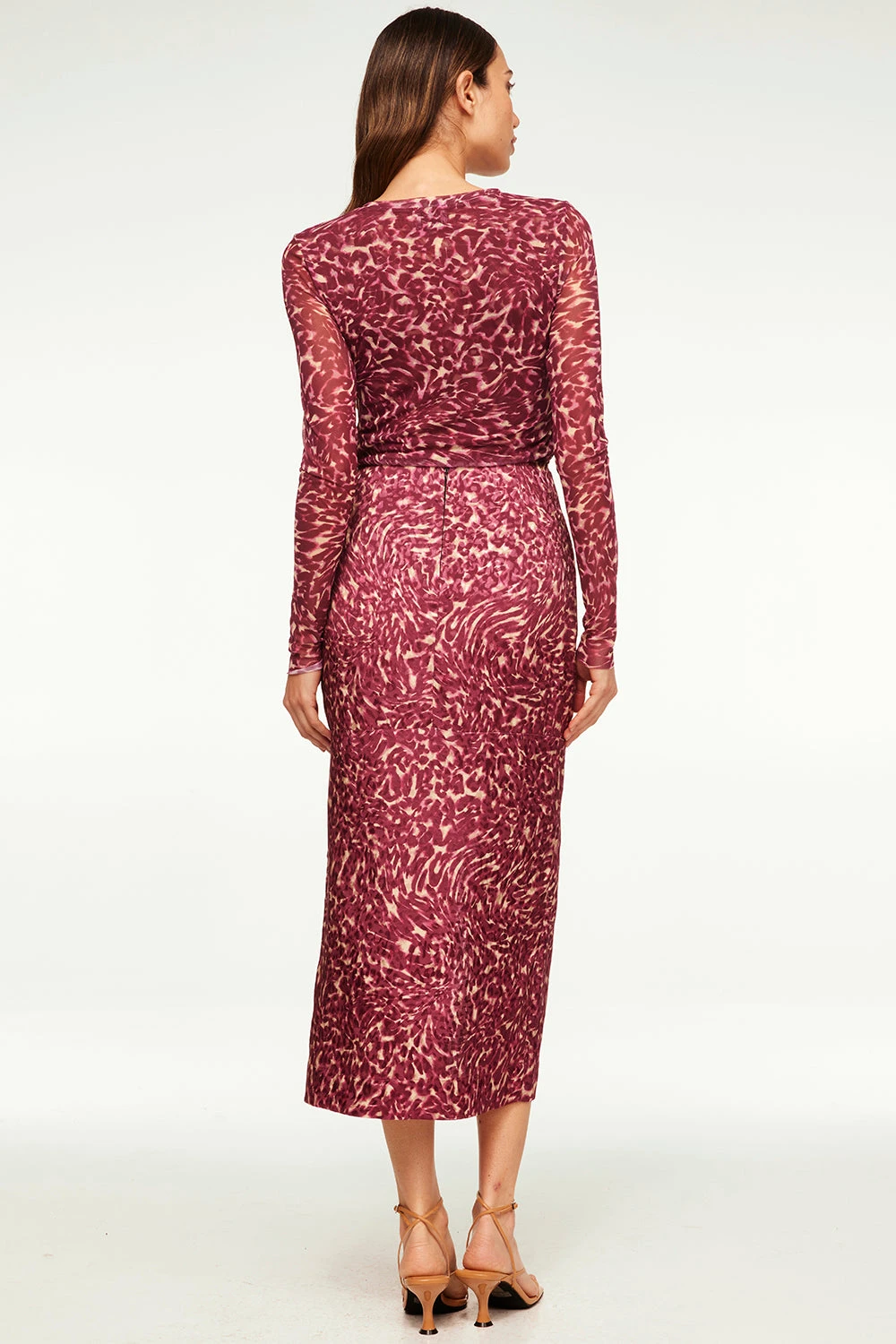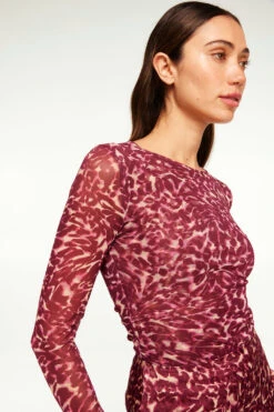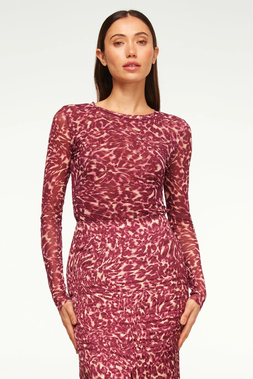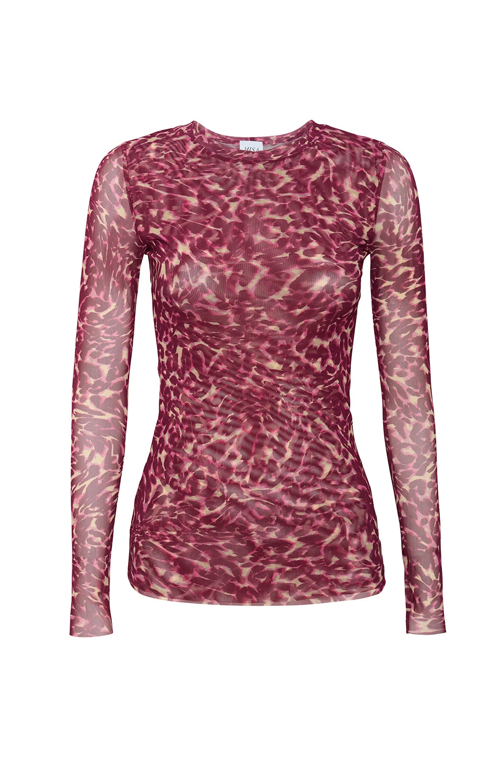 Our new Lula top is a long sleeve, fitted silhouette cut from an on-trend fuchsia leopard print mesh. The body is double lined and the sleeves are sheer. Crew neckline. Pair with the coordinating Ivan skirt for a standout set or with your favorite pair of jeans.