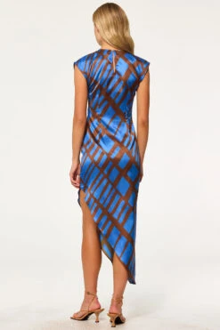 Lydia is a modern silhouette in our striking blue and brown Matrix printed satin. Sleeveless with a high neckline and a back summary closure at the neck, it’s fitted through the bodice and hips for a sleek shape. An asymmetrical skirt starts at a mini length and extends to a point just above the ankle. Pair it with heels or flats to suit the occasion.