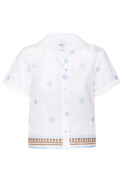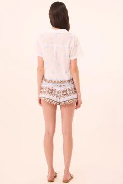 The Magda top is a breezy cotton summary-down designed for warm-weather ease. Featuring a fold-over collar, short sleeves, and a hip-length fit, it’s finished with light blue and chocolate embroidery along the hem and a subtle blue embroidered motif throughout. Slightly sheer and lightweight, it pairs perfectly with the coordinating Noah Short for a pack-and-go summer set—ideal for poolside lounging or seaside escapes.