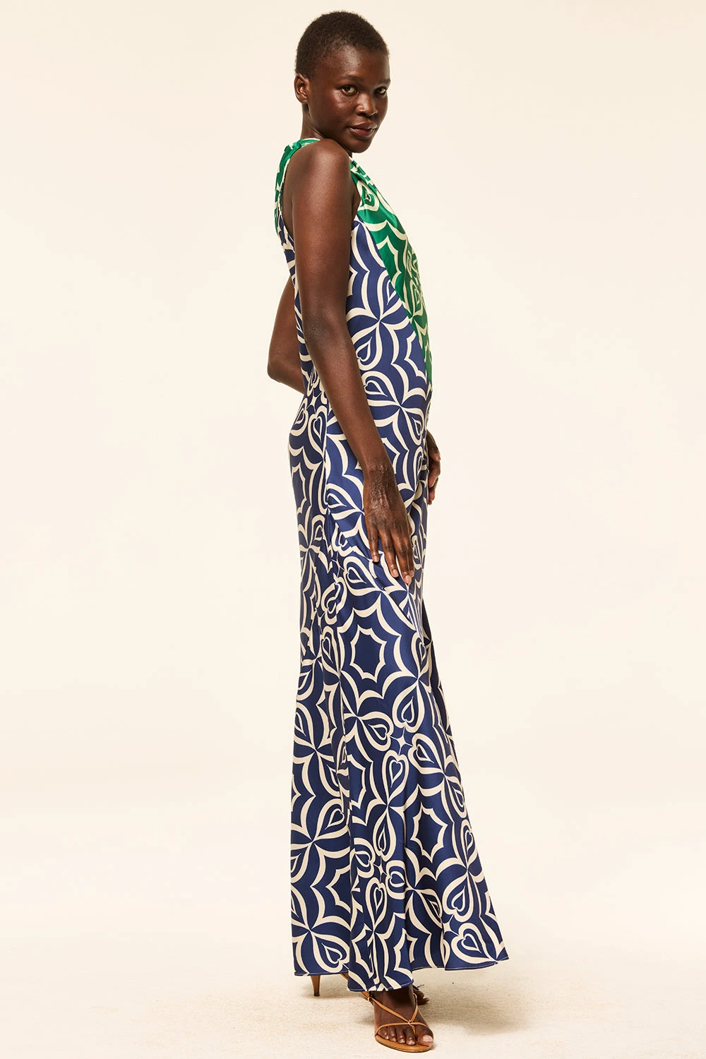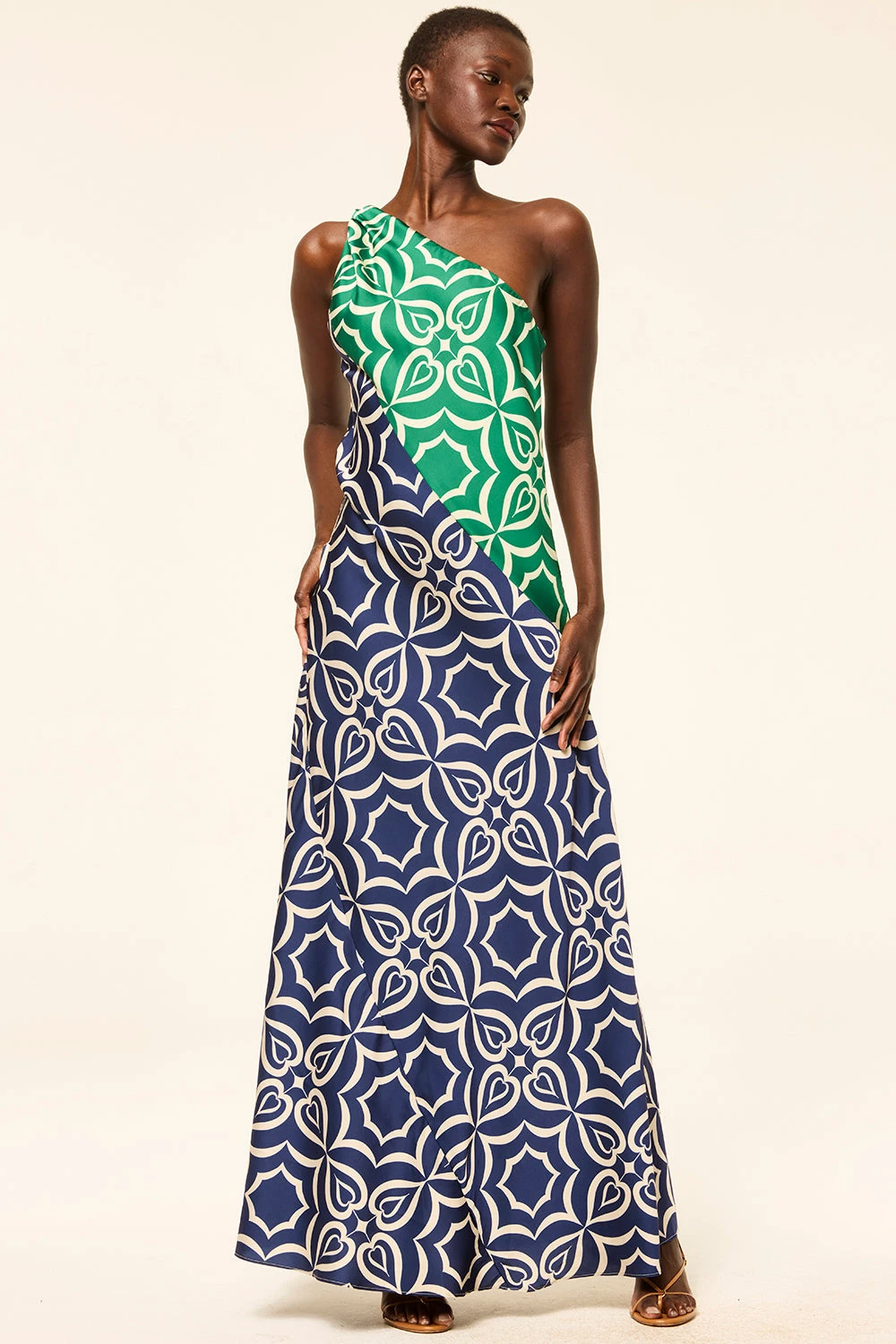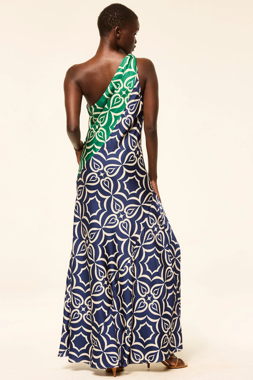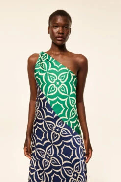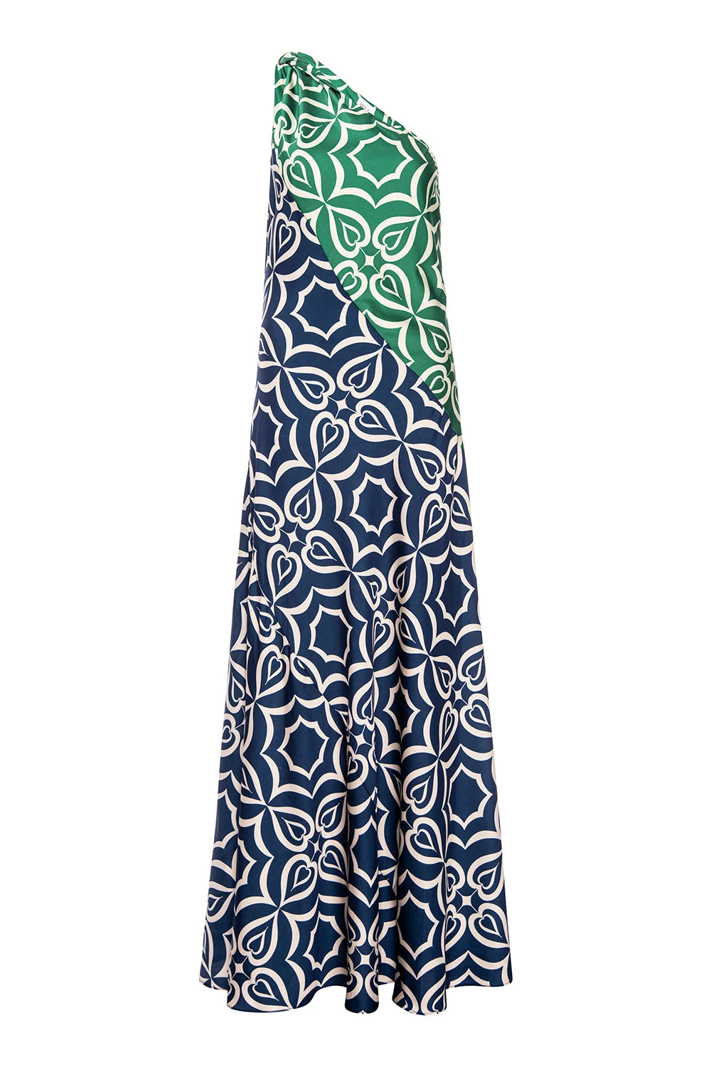 The Magdalene is a striking one-shoulder maxi cut from our silky satin in a bold mix of Green and Navy Mosaic Tile prints. Featuring a gathered shoulder detail and an asymmetrical neckline, the fluid, floor-grazing silhouette is finished with a hidden side zip for a sleek fit. Dress it up with heels for your next event or special occasion.