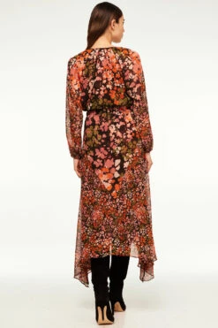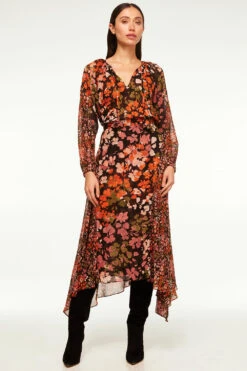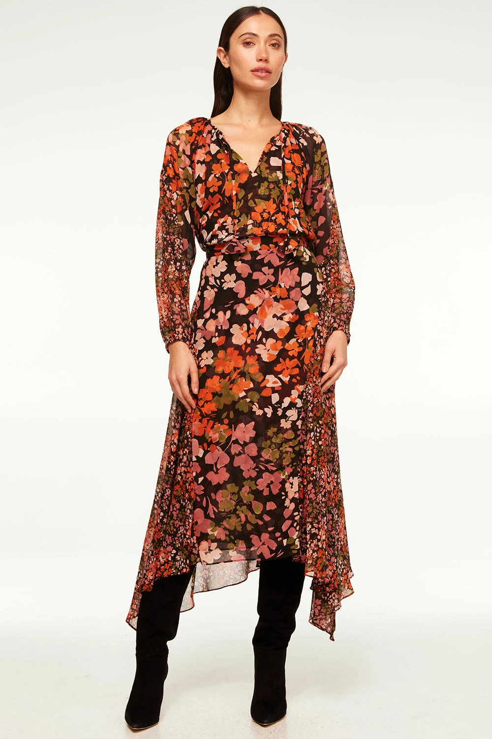 Our new Maral skirt is the epitome of fall fashion, cut from our Autumn Flora mix chiffon. This asymmetrical midi length skirt features a handkerchief hem in contrasting scales of floral chiffon. Double self lined. A flat banded front waist with a covered elastic back and hidden side zip closure. Wear with the coordinating Dema top for a head to toe look or pair with the black Nadja top.