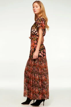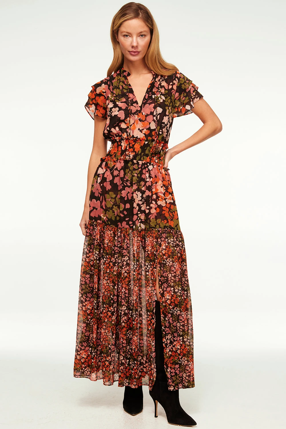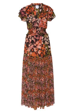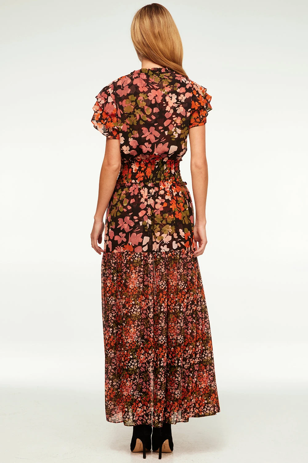 Our new Maribar maxi dress combines all the elements of some of our classic, best-selling pieces. Cut from a mixed Autumn Flora chiffon, it features short ruffle tiered sleeves, a split v neckline with adjustable petal tassel ties and a flattering wide smocked elastic waistband that leads into a tiered flowing skirt in contrast florals with a front slit. Pair this with everything from flats to boots.