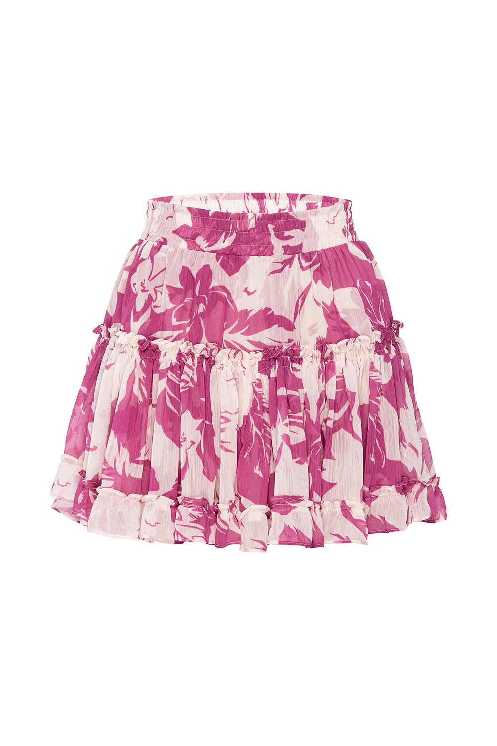 One of our signature silhouettes is back in a Fuchsia Flora print. This effortless piece is crafted from layers of romantic ruffles and features an elastic waistband that comfortably sits on the waist. A slightly curved hem and longer back accentuates the flattering silhouette that can be paired with everything from a white tee to our coordinating Maria top.