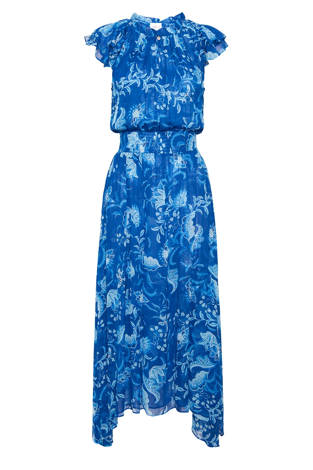 Mariposa is a fresh maxi silhouette, reimagined for summer in vibrant Fiji Flora–printed chiffon. Effortless and feminine, it features short ruffle sleeves, smocked shoulders, a split neckline, and a comfortable smocked waist. A flowing handkerchief hem adds soft movement, making it the perfect day-to-dinner dress for this season and beyond.