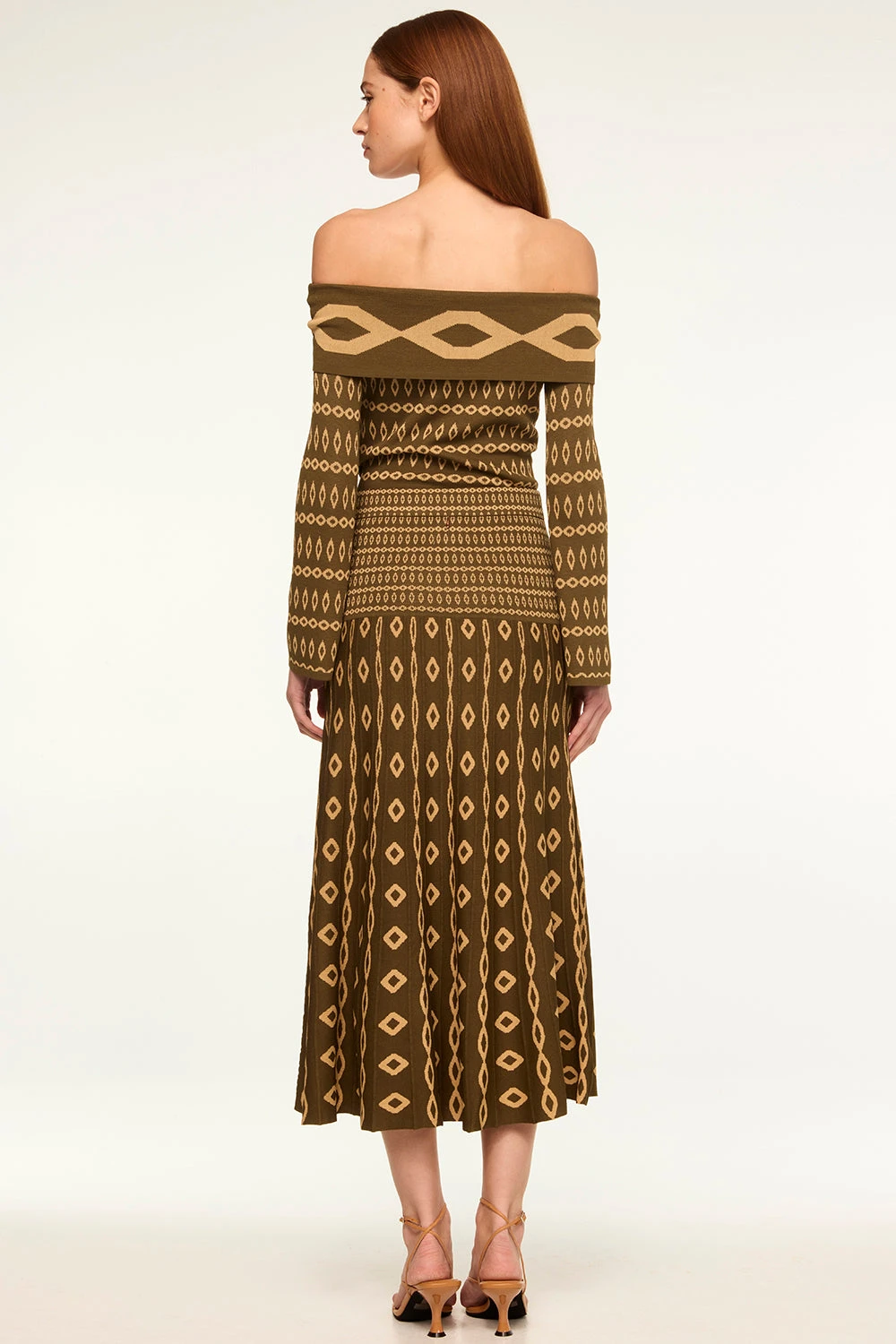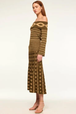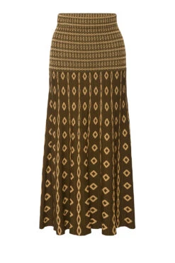 Our Milani knit skirt is a chic fit and flare pleated rib knit silhouette in an olive geo printed jacquard. This midi length silhouette features a chic drop waist and is the perfect length for the transitional weather, paired with everything from boots to strappy heels. Wear with the coordinating Alani or River tops.