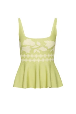 Miley is a fitted peplum silhouette crafted from the same vibrant citron stretch knit jacquard as the coordinating Lexi Short. Featuring a scoop square neckline, thin straps, and a flared peplum hem, this sleeveless style is accented with a tonal motif at the chest and waist. With its flattering stretch and playful shape, it’s perfect for creating a fresh, summer-ready set.