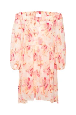 Millie is a romantic, bohemian-inspired off-the-shoulder mini dress cut from dreamy Watercolor Floral chiffon. Featuring an elasticated neckline, long billowy semi-sheer sleeves with elastic cuffs, and a loose, flowing fit, this double-lined silhouette hits at mid-thigh with a subtle high-low hem. The perfect warm-weather dress—easy to style with everything from flats to heels for your next event.