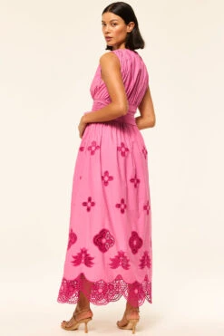 Our Myrtle dress is a new midi style in a vibrant fuchsia cotton poplin with gorgeous tonal lace embroidery on the skirt and hem. Sleeveless with a v neckline and a gathered bodice and wide smocked waistband with an optional tie detail for a truly feminine look. This perfect day to dinner style will carry you through spring and beyond.