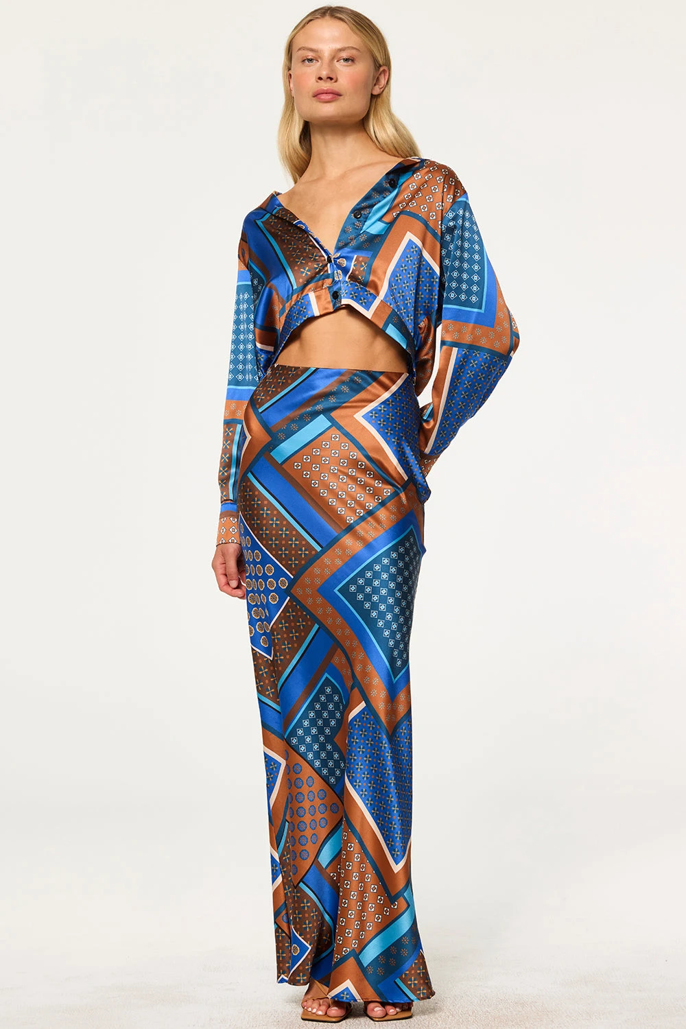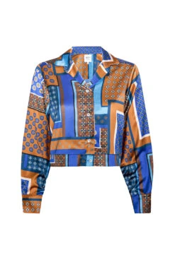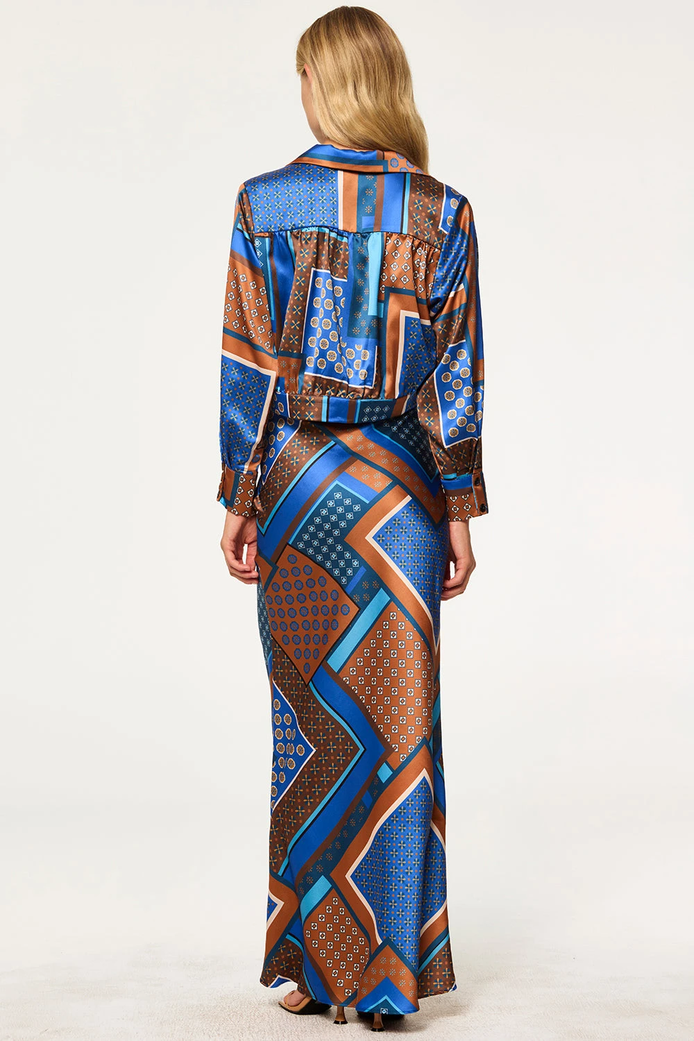 Nadine is a chic cropped shirt jacket in our vibrant Tile Patchwork printed satin with rich brown and electric blue hues. It features a foldover collar, V neckline, summary front, and long sleeves with summary cuffs. Gathered at the back yoke for a blouson fit and finished with a banded bottom, Nadine pairs perfectly with a white tank and denim or the coordinating Sierra skirt.