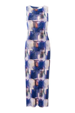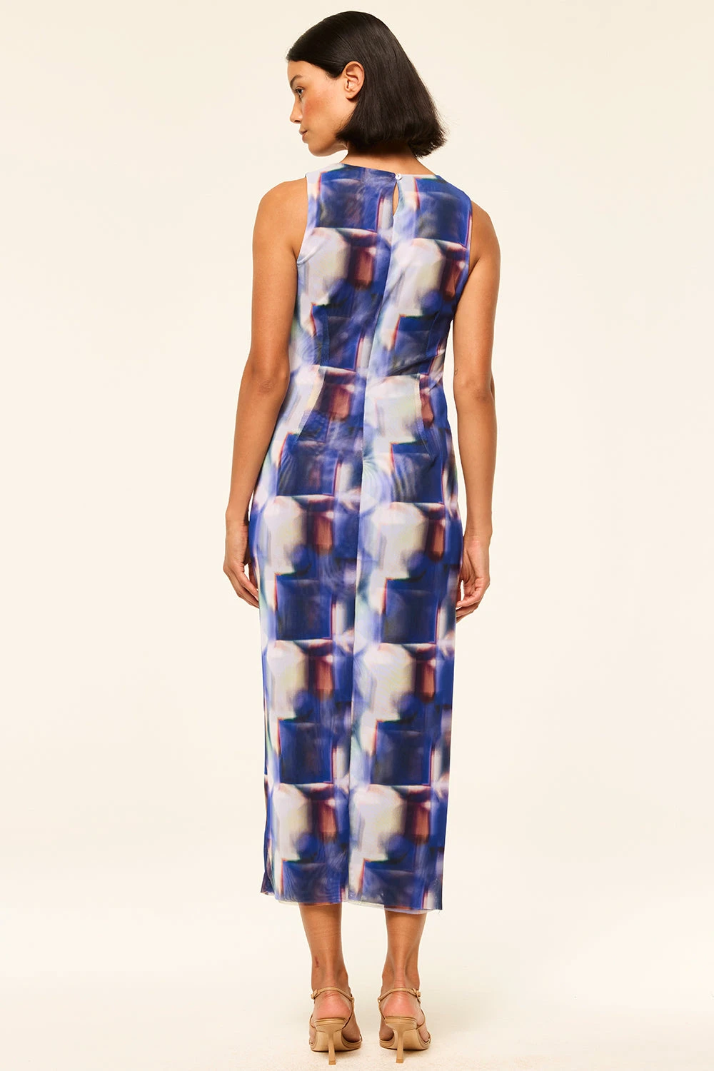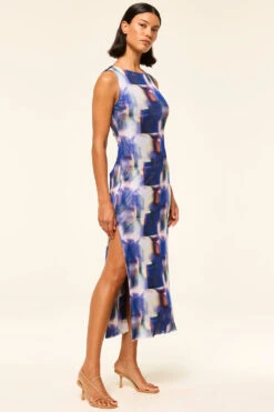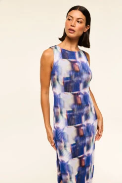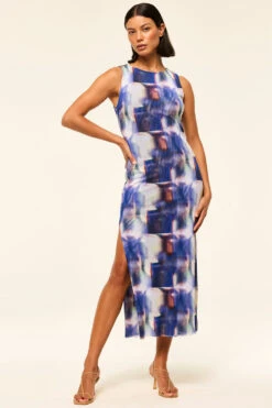 Our best-selling Nakia dress is back in a modern Amethyst Geo printed mesh for spring. This figure-hugging sleeveless silhouette features a high neckline and thigh baring side slit. Slightly sheer and double lined. Pull-on style. Pair with everything from strappy heels to flats.